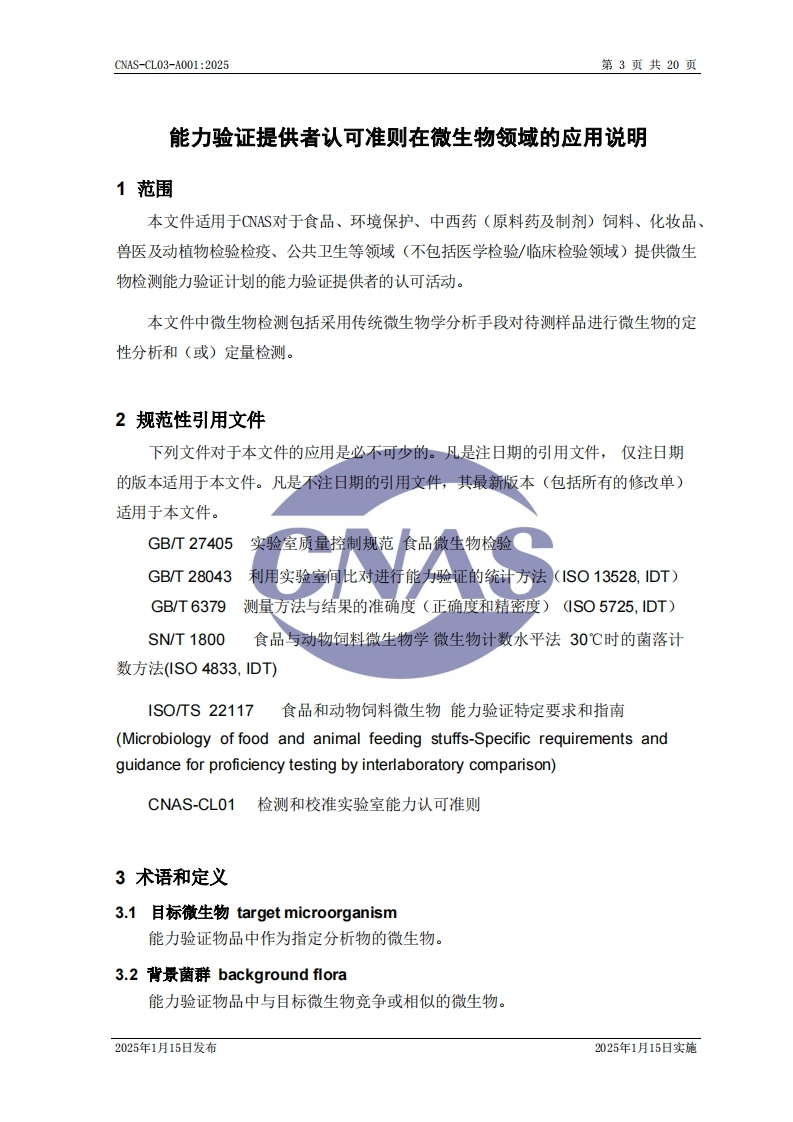 CNASCNAS-CL03-A001能力验证提供者认可准则在微生物领域的应用说明Guidance on the Application of AccreditationCriteria for Proficiency Testing Providers in theField of Microbiology版权声明本文件版权归中国合格评定国家认可委员会(CNAS)所有,CNAS对其亨有完全的著作权及与著作权有关的权利。在遵守《中华人民共和国著作权法》及其他相关法律法规的前提下,机构及人员等可免费使用本文件进行非商业性的学习和研究。未经CNAS书面授权准许,禁止任何单位和个人复制、传播、发行、汇编、改编、翻译或以其他形式对本文件再创作等,侵权必究。CNAS网站:www.cnas.org.cn中国合格评定国家认可委员会2025年1月15日发布2025年1月15日实施