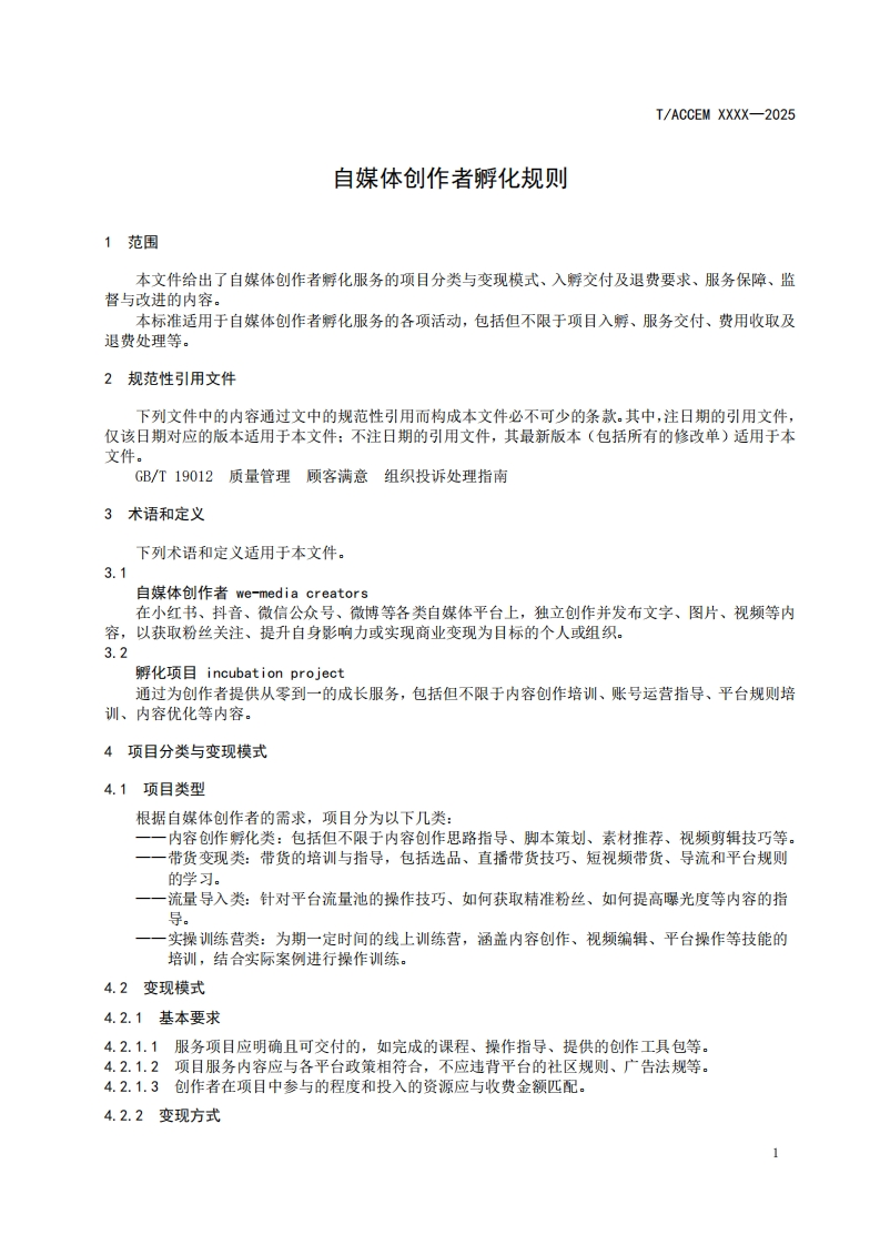 自媒体创作者孵化规则Incubationrulesforwe-mediacreators348072@abc前天发布关注私信0.25MB10页027自媒体创作者孵化规则Incubationrulesforwe-mediacreators此内容为付费资源,请付费后查看¥19¥23黄金会员免费钻石会员免费立即购买您当前未登录!建议登陆后购买,可保存购买订单付费资源 第1页 / 共10页 第2页 / 共10页 第3页 / 共10页 第4页 / 共10页 第5页 / 共10页 试读已结束,还剩5页,您可下载完整版后进行离线阅读 THE END标准规范 文本预览 ICS03.080CCS A12T/ACCEM团体标准T/ACCEM XXXX-2025自媒体创作者孵化规则Incubation rules for we-media creators(征求意见稿)2025-Xx-XX发布2025-Xx-XX实施中国商业企业管理协会发布 查看更多 收起部分 喜欢就支持一下吧收藏