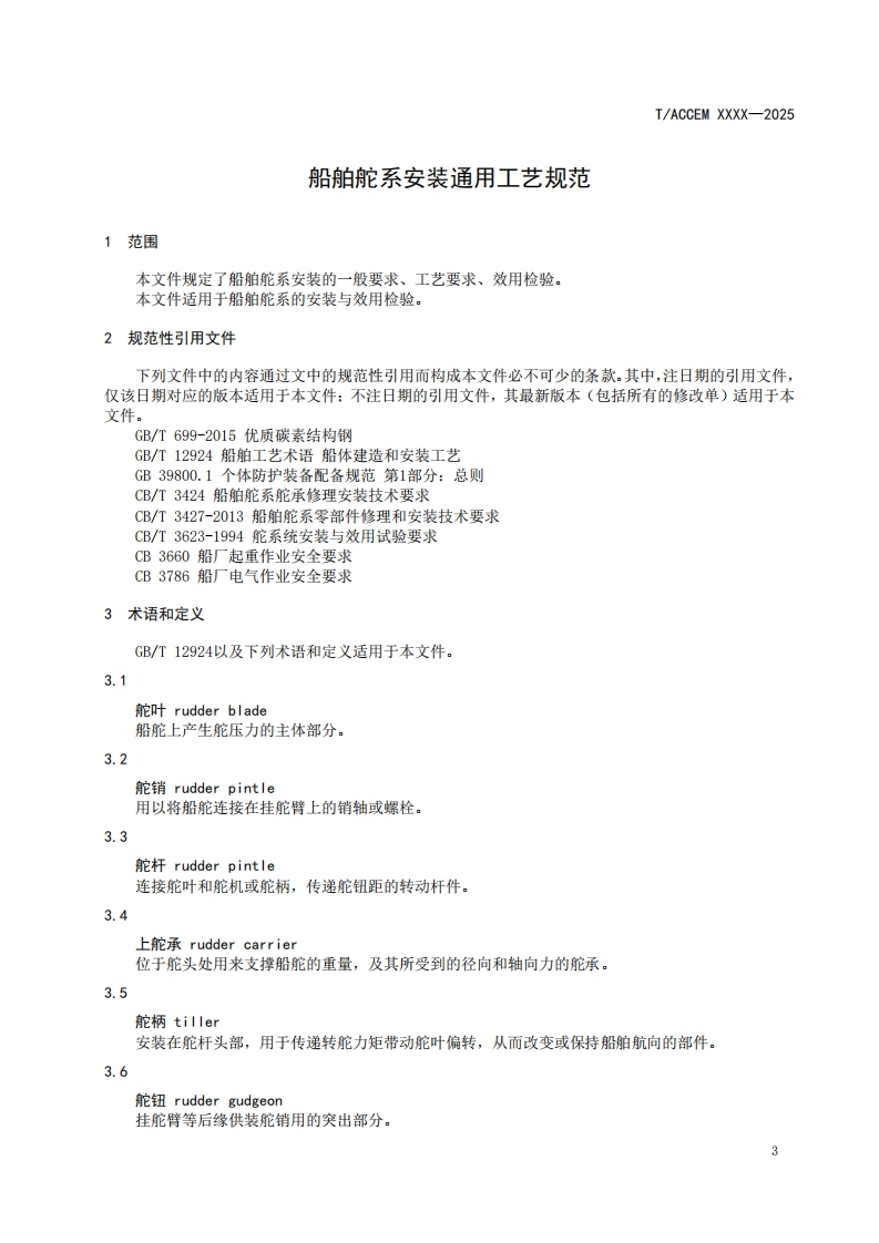 船舶舵系安装通用工艺规范Generalprocessspecificationforinstallationofshipsteeringsystem348072@abc前天发布关注私信0.23MB10页041船舶舵系安装通用工艺规范Generalprocessspecificationforinstallationofshipsteeringsystem此内容为付费资源,请付费后查看¥19¥23黄金会员免费钻石会员免费立即购买您当前未登录!建议登陆后购买,可保存购买订单付费资源 第1页 / 共10页 第2页 / 共10页 第3页 / 共10页 第4页 / 共10页 第5页 / 共10页 试读已结束,还剩5页,您可下载完整版后进行离线阅读 THE END标准规范 文本预览 ICS47.020.50CCS R 32TACCEM团体标准T/ACCEM XXXX-2025船舶舵系安装通用工艺规范General process specification for installation of ship steering system(征求意见稿)在提交反债意见时,请将您知道的相关专利连同支持性文件一并附上。2025-Xx-XX发布2025-Xx-XX实施中国商业企业管理协会发布 查看更多 收起部分 喜欢就支持一下吧收藏