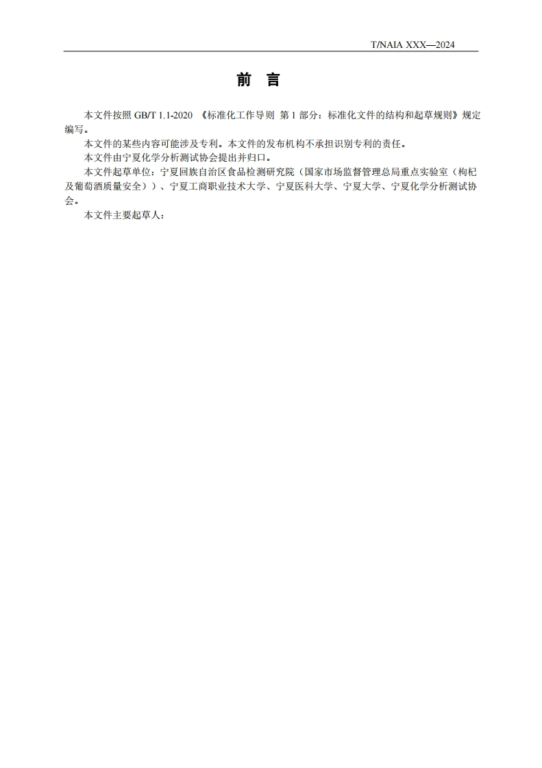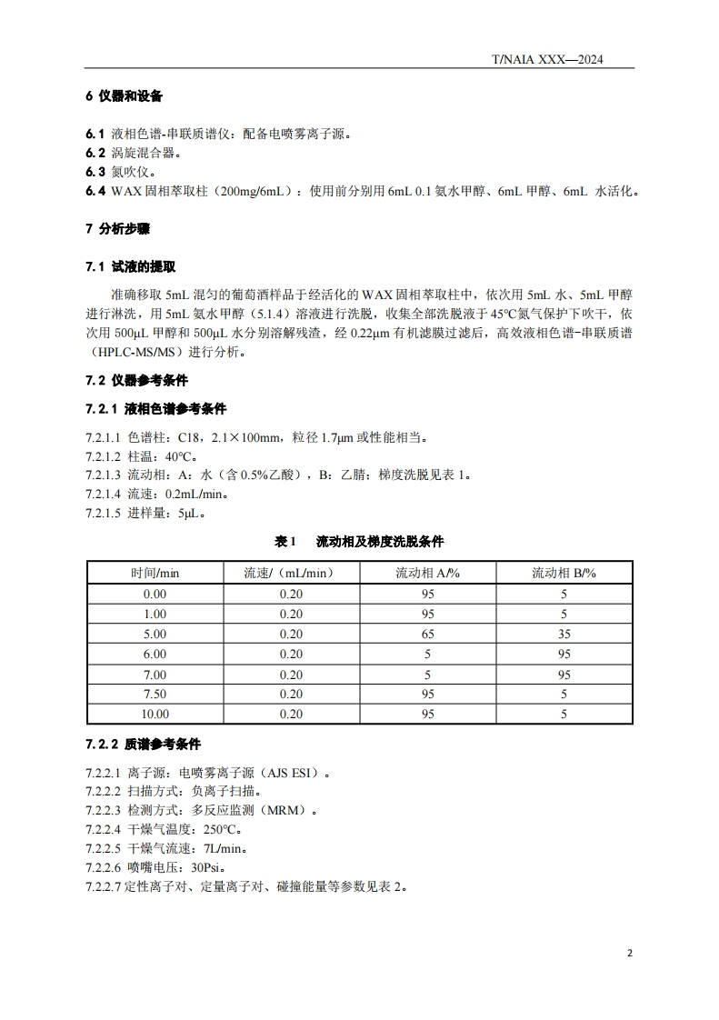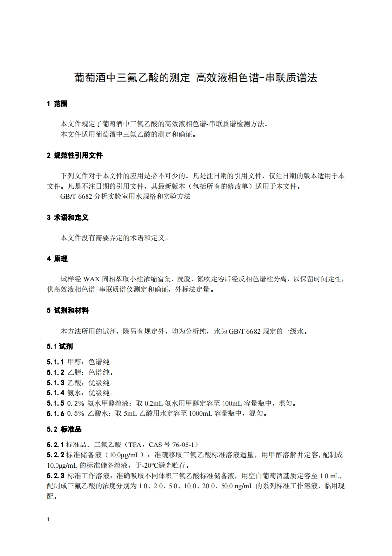 葡萄酒中三氟乙酸的测定高效液相色谱-串联质谱法SimultaneousDeterminationofTrifluoroaceticacid(TFA)ResiduesinWinebyHPLC-MS_MS348072@abc2天前发布关注私信0.50MB7页040葡萄酒中三氟乙酸的测定高效液相色谱-串联质谱法SimultaneousDeterminationofTrifluoroaceticacid(TFA)ResiduesinWinebyHPLC-MS_MS此内容为付费资源,请付费后查看¥19¥23黄金会员免费钻石会员免费立即购买您当前未登录!建议登陆后购买,可保存购买订单付费资源 第1页 / 共7页 第2页 / 共7页 第3页 / 共7页 第4页 / 共7页 第5页 / 共7页 试读已结束,还剩2页,您可下载完整版后进行离线阅读 THE END标准规范 文本预览 ICS67.050B20团体标准T/NAIA XXX-2025葡萄酒中三氟乙酸的测定高效液相色谱~串联质谱法Simultaneous Determination of Trifluoroacetic acid (TFA)Residues in Wineby HPLC-MS/MS2025-XX-XX发布2025-XX-XX实施宁夏化学分析测试协会发布 查看更多 收起部分 喜欢就支持一下吧收藏