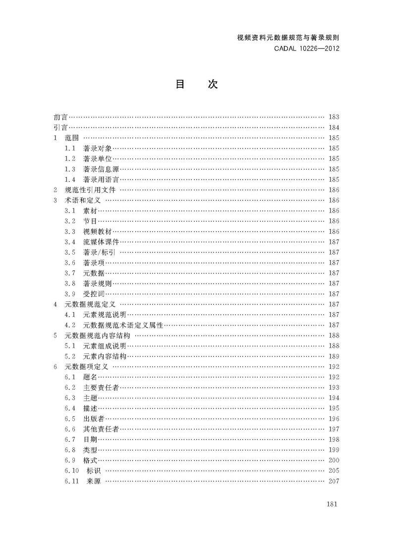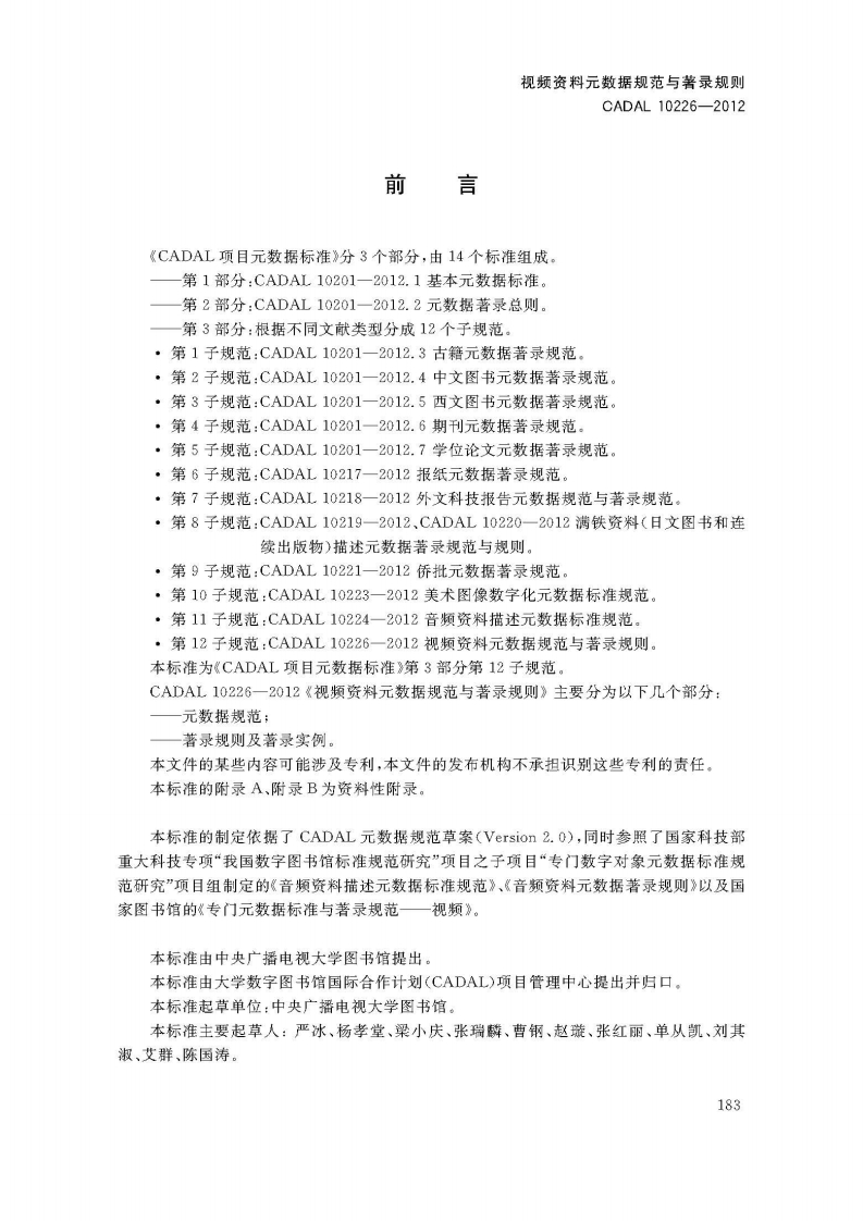 视频资料元数据规范与著录规则VideoMaterialMetadataSt_ndardandCataloguingRules第-稿348072@abc3天前发布关注私信10.12MB50页044视频资料元数据规范与著录规则VideoMaterialMetadataSt_ndardandCataloguingRules第-稿此内容为付费资源,请付费后查看¥19¥23黄金会员免费钻石会员免费立即购买您当前未登录!建议登陆后购买,可保存购买订单付费资源 第1页 / 共50页 第2页 / 共50页 第3页 / 共50页 第4页 / 共50页 第5页 / 共50页 试读已结束,还剩45页,您可下载完整版后进行离线阅读 THE END标准规范 文本预览 1CS01.140.20A14C A D A L项目标准CADAL10226-2012视频资料元数据规范与著录规则Video Material Metadata Standard and Cataloguing Rules第一稿2012-02-282012-05-08发布2012-05-09实施CADAL项目管理中心发布 查看更多 收起部分 喜欢就支持一下吧收藏