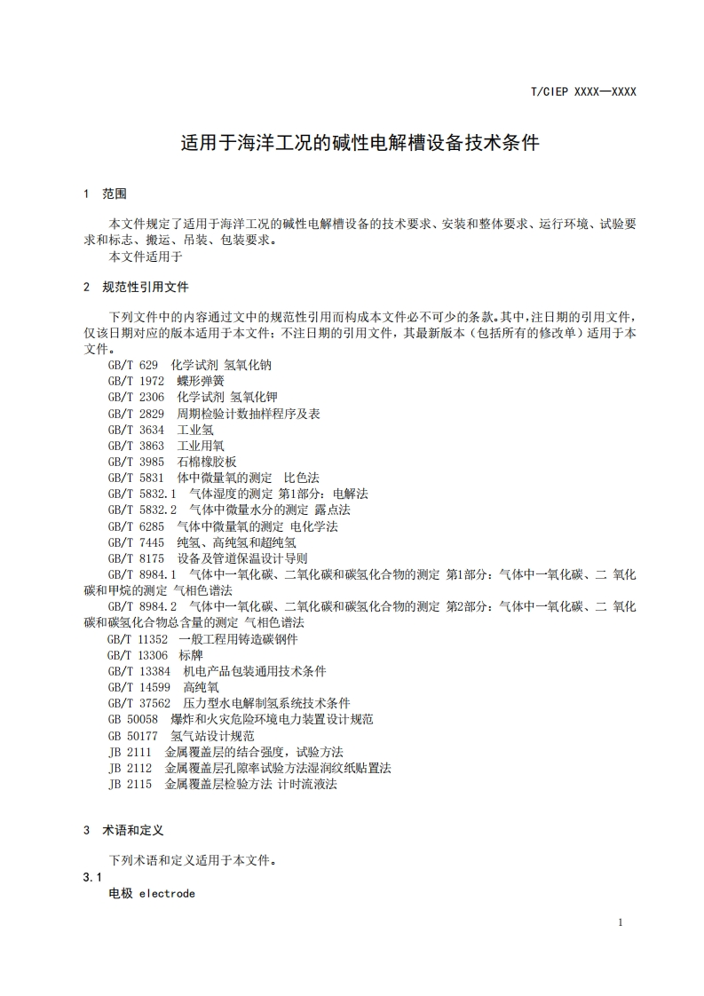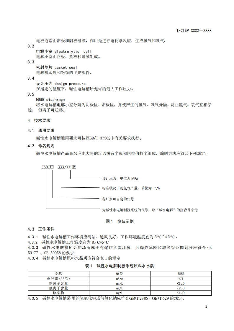 ICS27.010CCS F 19CIEP中国工业环保促进会团体标准T/CIEP XXXX-XXXX适用于海洋工况的碱性电解槽设备技术条件Technical specifications for alkaline electrolyzer equipment suitable for marinecondition(工作组讨论稿)在提交反馈意见时,请将您知道的相关专利连同支持性文件一并附上。XXXX-Xx-XX发布XXXX-Xx-XX实施中国工业环保促进会发布