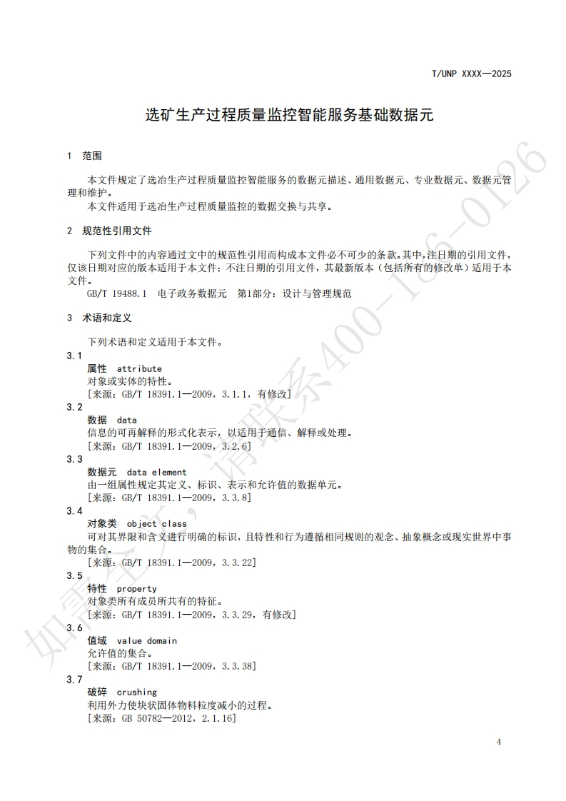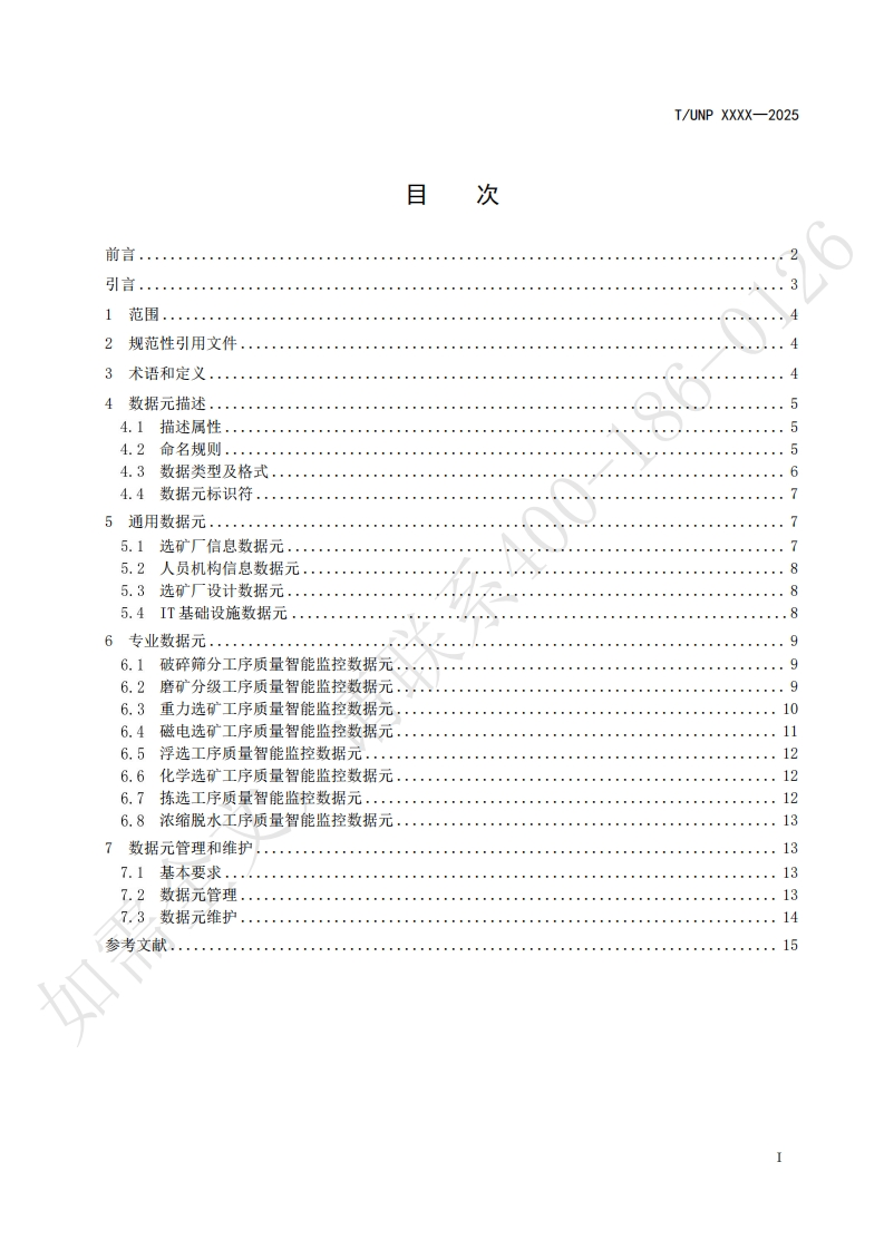 ICS77.120.01UNSPSC 73.12CCSH04UNP团体标准T/UNP XXXX-2025选矿生产过程质量监控智能服务基础数据元Basic data elements of intelligent service for quality monitoring in the mineralprocessing production process(征求意见稿)如需全文,2025-Xx-XX发布2025-Xx-XX实施中国联合国采购促进会发布