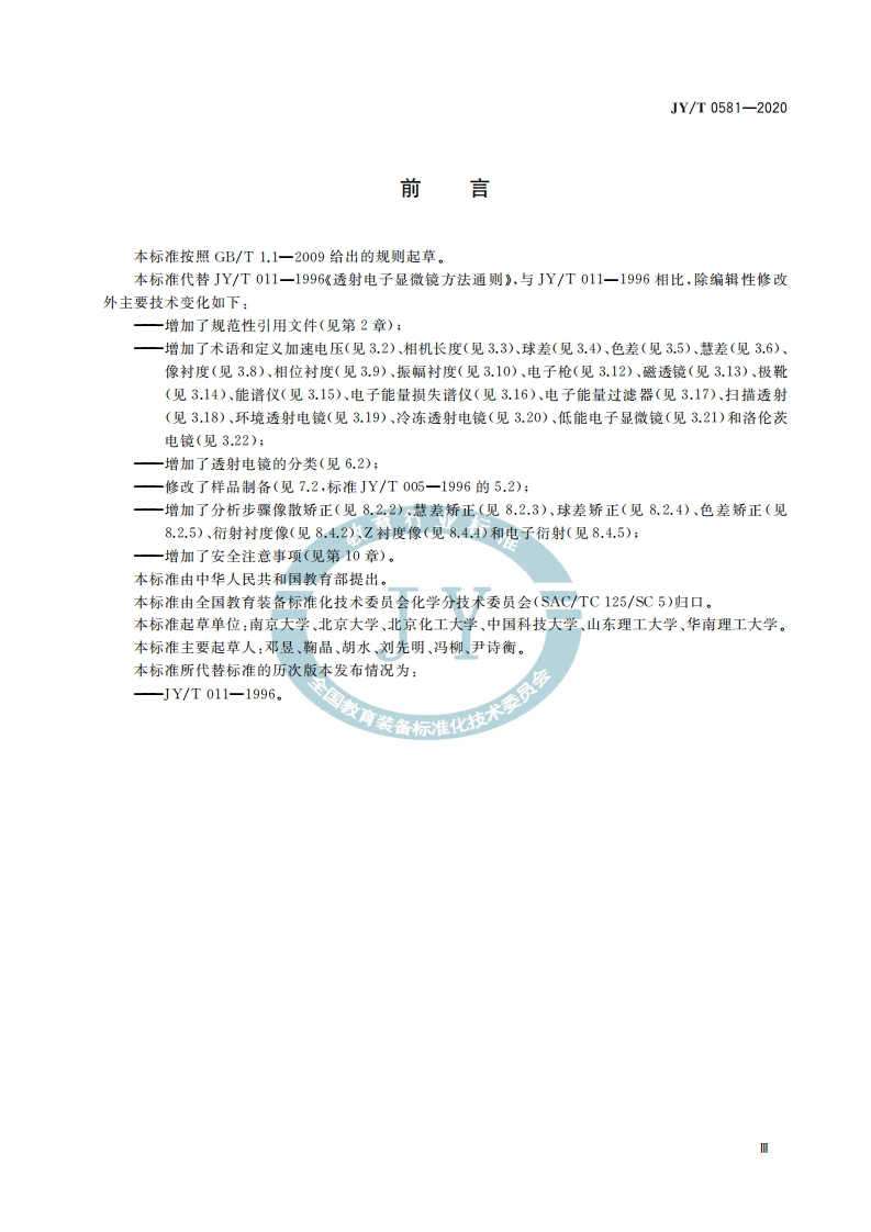 透射电子显微镜分析方法通则Generalanalysisrulesfortransmissionelectronmicroscope教育漩篙标准化历348072@abc4天前发布关注私信2.88MB18页041透射电子显微镜分析方法通则Generalanalysisrulesfortransmissionelectronmicroscope教育漩篙标准化历此内容为付费资源,请付费后查看¥19¥23黄金会员免费钻石会员免费立即购买您当前未登录!建议登陆后购买,可保存购买订单付费资源 第1页 / 共18页 第2页 / 共18页 第3页 / 共18页 第4页 / 共18页 第5页 / 共18页 试读已结束,还剩13页,您可下载完整版后进行离线阅读 THE END标准规范 文本预览 1CS03.180Y51JY中华人民共和国教育行业标准JY/T0581一2020代替JY/T011-1996透射电子显微镜分析方法通则General analysis rules for transmission electron microscopeJY全国教育装备标准化技术委员2020-09-29发布2020-12-01实施中华人民共和国教育部发布 查看更多 收起部分 喜欢就支持一下吧收藏