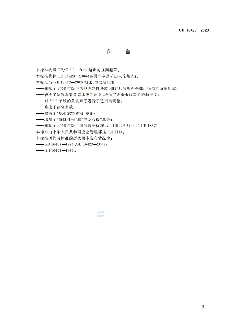 金属非金属矿山安全规程Safetyregulationformetalandnonmetalmines348072@abc3天前发布关注私信5.35MB68页030金属非金属矿山安全规程Safetyregulationformetalandnonmetalmines此内容为付费资源,请付费后查看¥19¥23黄金会员免费钻石会员免费立即购买您当前未登录!建议登陆后购买,可保存购买订单付费资源 第1页 / 共68页 第2页 / 共68页 第3页 / 共68页 第4页 / 共68页 第5页 / 共68页 试读已结束,还剩63页,您可下载完整版后进行离线阅读 THE END标准规范 文本预览 ICS13.100C72B中华人民共和国国家标准GB16423-2020代替GB16423一2006金属非金属矿山安全规程Safety regulation for metal and nonmetal mines2020-10-11发布2021-09-01实施国家市场监督管理总局国家标准化管理委员会发布 查看更多 收起部分 喜欢就支持一下吧收藏