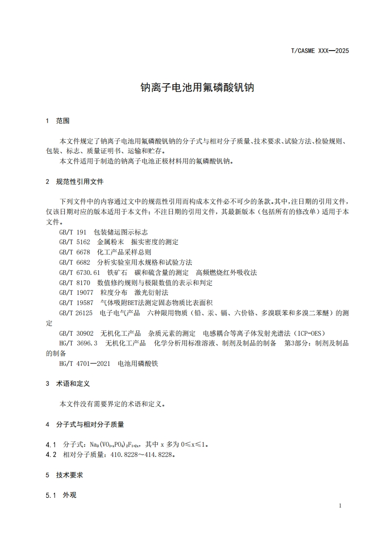 钠离子电池用氟磷酸钒钠Sodiumvanadiumfluorophosphateforsodiumionbatteries在提交反馈意见时请将您知道的相关专利连同支持性文件一并附上。348072@abc3天前发布关注私信0.40MB9页024钠离子电池用氟磷酸钒钠Sodiumvanadiumfluorophosphateforsodiumionbatteries在提交反馈意见时请将您知道的相关专利连同支持性文件一并附上。此内容为付费资源,请付费后查看¥19¥23黄金会员免费钻石会员免费立即购买您当前未登录!建议登陆后购买,可保存购买订单付费资源 第1页 / 共9页 第2页 / 共9页 第3页 / 共9页 第4页 / 共9页 第5页 / 共9页 试读已结束,还剩4页,您可下载完整版后进行离线阅读 THE END标准规范 文本预览 1CS71.060.50CCS G 12TCASME团体标准T/CASME XXX-2025钠离子电池用氟磷酸钒钠Sodium vanadium fluorophosphate for sodium ion batter ies(征求意见稿)在提交反馈意见时,请将您知道的相关专利连同支持性文件一并附上。2025-XX-XX发布2025-Xx-XX实施中国中小商业企业协会发布 查看更多 收起部分 喜欢就支持一下吧收藏