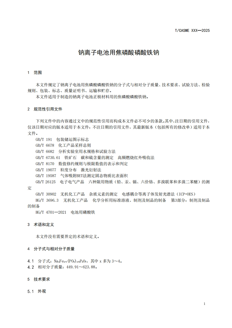 钠离子电池用焦磷酸磷酸铁钠Sodiumferricpyrophosphateforsodiumionbatteries在提交反馈意见时请将您知道的相关专利连同支持性文件一并附上。348072@abc3天前发布关注私信0.40MB9页039钠离子电池用焦磷酸磷酸铁钠Sodiumferricpyrophosphateforsodiumionbatteries在提交反馈意见时请将您知道的相关专利连同支持性文件一并附上。此内容为付费资源,请付费后查看¥19¥23黄金会员免费钻石会员免费立即购买您当前未登录!建议登陆后购买,可保存购买订单付费资源 第1页 / 共9页 第2页 / 共9页 第3页 / 共9页 第4页 / 共9页 第5页 / 共9页 试读已结束,还剩4页,您可下载完整版后进行离线阅读 THE END标准规范 文本预览 1Cs71.060.50CCS G 12TCASME团体标准T/CASME XXX-2025钠离子电池用焦磷酸磷酸铁钠Sodium ferric pyrophosphate for sodium ion batteries(征求意见稿)在提交反馈意见时,请将您知道的相关专利连同支持性文件一并附上。2025-XX-XX发布2025-Xx-XX实施中国中小商业企业协会发布 查看更多 收起部分 喜欢就支持一下吧收藏