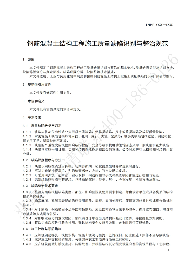 ICS91.010.01UNSPSC 81.10.15CCSP30UNP团体标准T/UNP XXXX-XXXX钢筋混凝土结构工程施工质量缺陷识别与整治规范Specification for identification and remediation of construction quality defects inreinforced concrete structural works获取全文在提交反馈意见时,请将您知道的相关专利连同支持性文件一并附上。XXXX-Xx-XX发布XXXX-x-XX实施中国联合国采购促进会发布