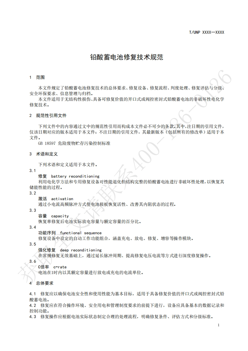 铅酸蓄电池修复技术规范Technicalspecificationforead-acidbatteryrepair请联348072@abc4天前发布关注私信0.26MB6页050铅酸蓄电池修复技术规范Technicalspecificationforead-acidbatteryrepair请联此内容为付费资源,请付费后查看¥19¥23黄金会员免费钻石会员免费立即购买您当前未登录!建议登陆后购买,可保存购买订单付费资源 第1页 / 共6页 第2页 / 共6页 第3页 / 共6页 第4页 / 共6页 第5页 / 共6页 试读已结束,还剩1页,您可下载完整版后进行离线阅读 THE END标准规范 文本预览 ICS29.220.20UNSPSC 26.11.17CCSK84UNP团体标准T/UNP XXXX-XXXX铅酸蓄电池修复技术规范Technical specification for lead-acid battery repair获取全文请联系XXXX-XX-XX发布XXXX-XX-XX实施中国联合国采购促进会发布 查看更多 收起部分 喜欢就支持一下吧收藏