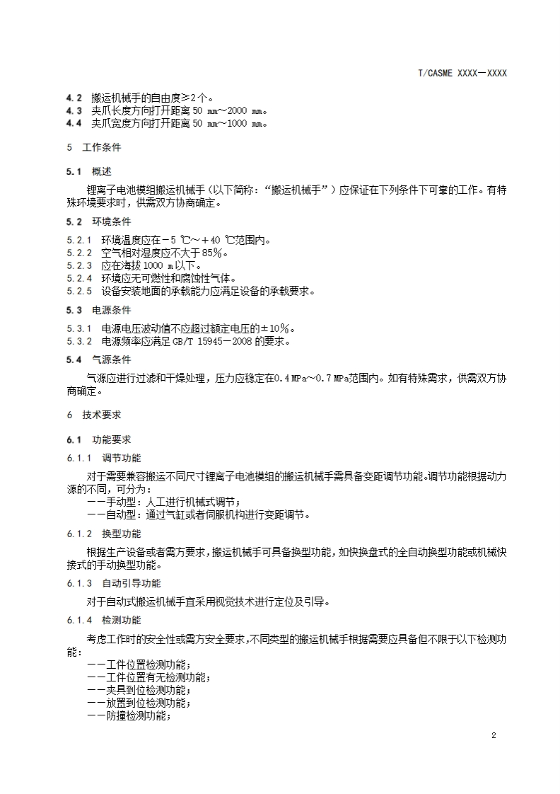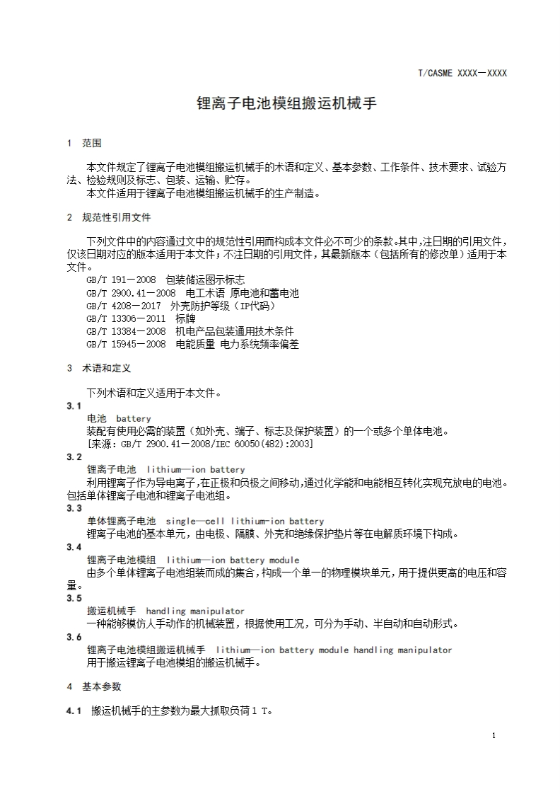 锂离子电池模组搬运机械手Lithium-ionbatterymodulehandlingrobot348072@abc4天前发布关注私信0.23MB8页034锂离子电池模组搬运机械手Lithium-ionbatterymodulehandlingrobot此内容为付费资源,请付费后查看¥19¥23黄金会员免费钻石会员免费立即购买您当前未登录!建议登陆后购买,可保存购买订单付费资源 第1页 / 共8页 第2页 / 共8页 第3页 / 共8页 第4页 / 共8页 第5页 / 共8页 试读已结束,还剩3页,您可下载完整版后进行离线阅读 THE END标准规范 文本预览 ICS点击此处添加1Cs号CCS点击此处添加cCS号T/CASME团体标准T/CASME XXXX-XXXX锂离子电池模组搬运机械手Lithium-ion battery module handling robot(征求意见稿)在提交反馈意见时,请将您知道的相联专连同肢持性文件一并附上。XXXX-XX-XX发布XXXX-XX-XX实施中国中小商业企业协会发布 查看更多 收起部分 喜欢就支持一下吧收藏