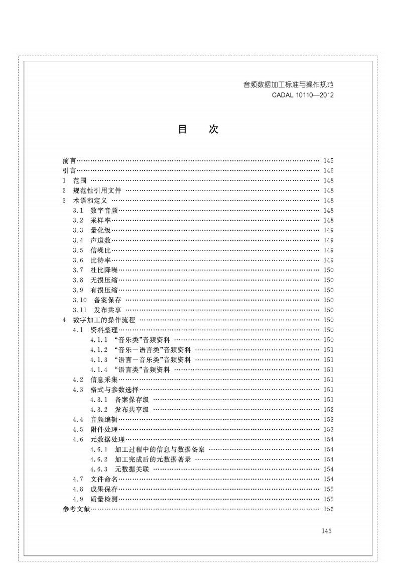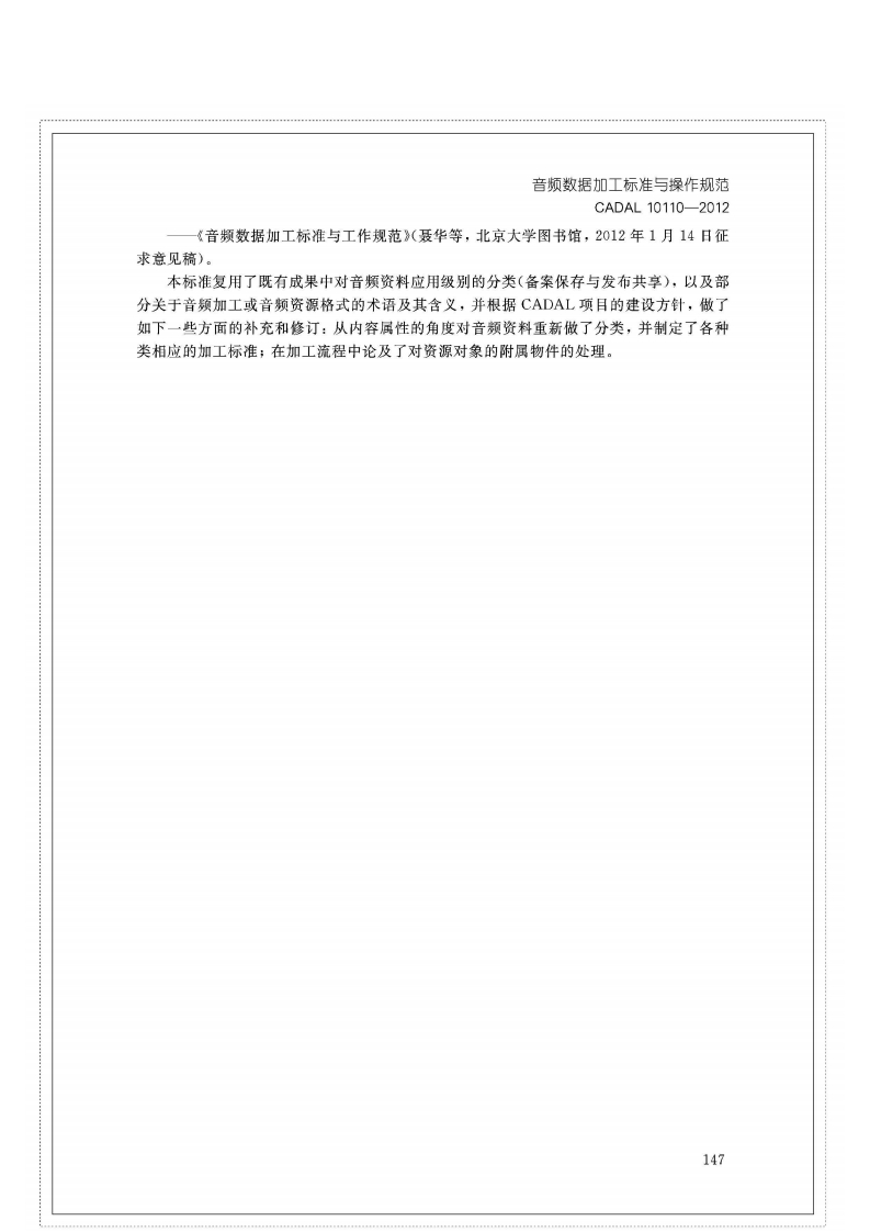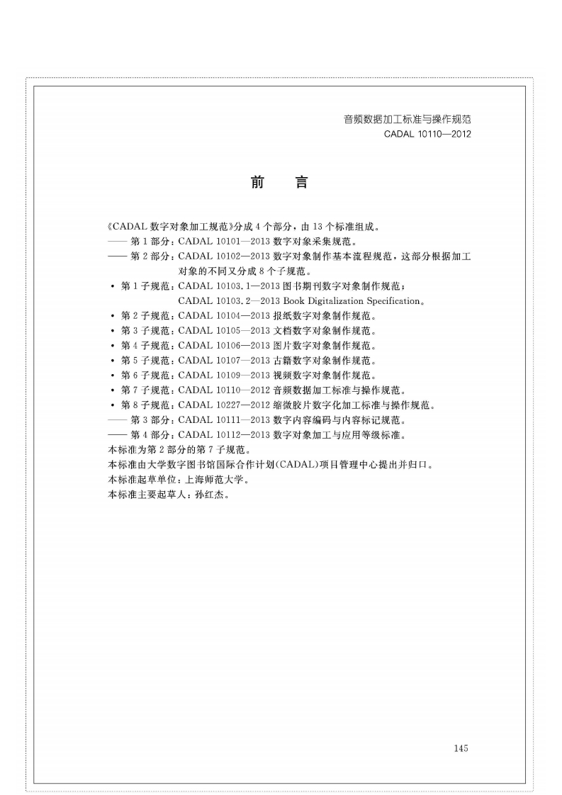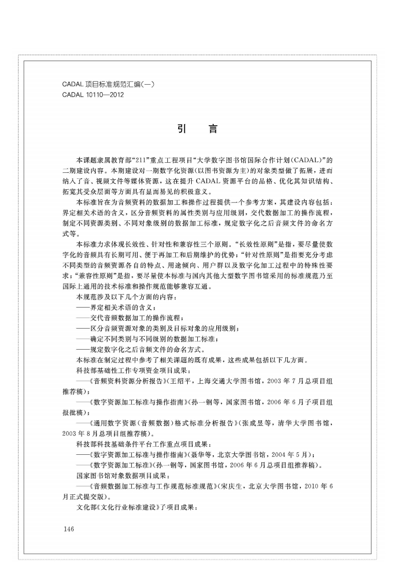 1CS01.140.20A14C AD A L项目标准CADAL10110-2012音频数据加工标准与操作规范Sound Recording Transferring and Reformatting:Processing Criterion and Operating Specification第一稿2012-05-012012-05-08发布2012-05-09实施CADAL项目管理中心发布金旭照排五校样开本:787×1092成品:185mm×260mm版芯:39字×39行行距:*2正文字体号:5SS2014.12.4