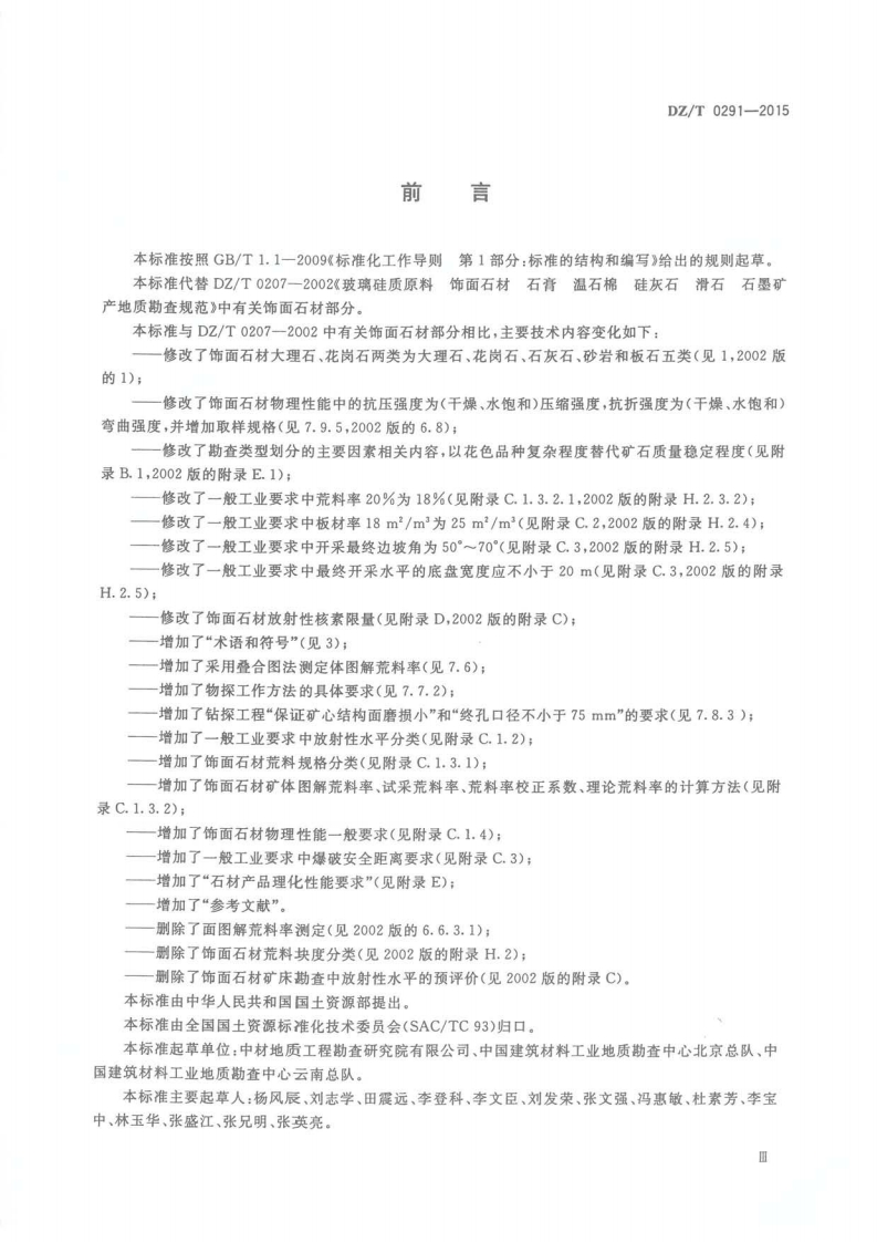饰面石材矿产地质勘查规范Specificationforfacingstonemineralexploration348072@abc5天前发布关注私信5.07MB39页041饰面石材矿产地质勘查规范Specificationforfacingstonemineralexploration此内容为付费资源,请付费后查看¥19¥23黄金会员免费钻石会员免费立即购买您当前未登录!建议登陆后购买,可保存购买订单付费资源 第1页 / 共39页 第2页 / 共39页 第3页 / 共39页 第4页 / 共39页 第5页 / 共39页 试读已结束,还剩34页,您可下载完整版后进行离线阅读 THE END标准规范 文本预览 1CS73.020D130z中华人民共和国地质矿产行业标准DZ/T0291-2015代替DZ/T0207一2002中饰面石材部分饰面石材矿产地质勘查规范Specification for facing stone mineral exploration2015-10-26发布2016-01-01实施中华人民共和国国土资源部发布 查看更多 收起部分 喜欢就支持一下吧收藏