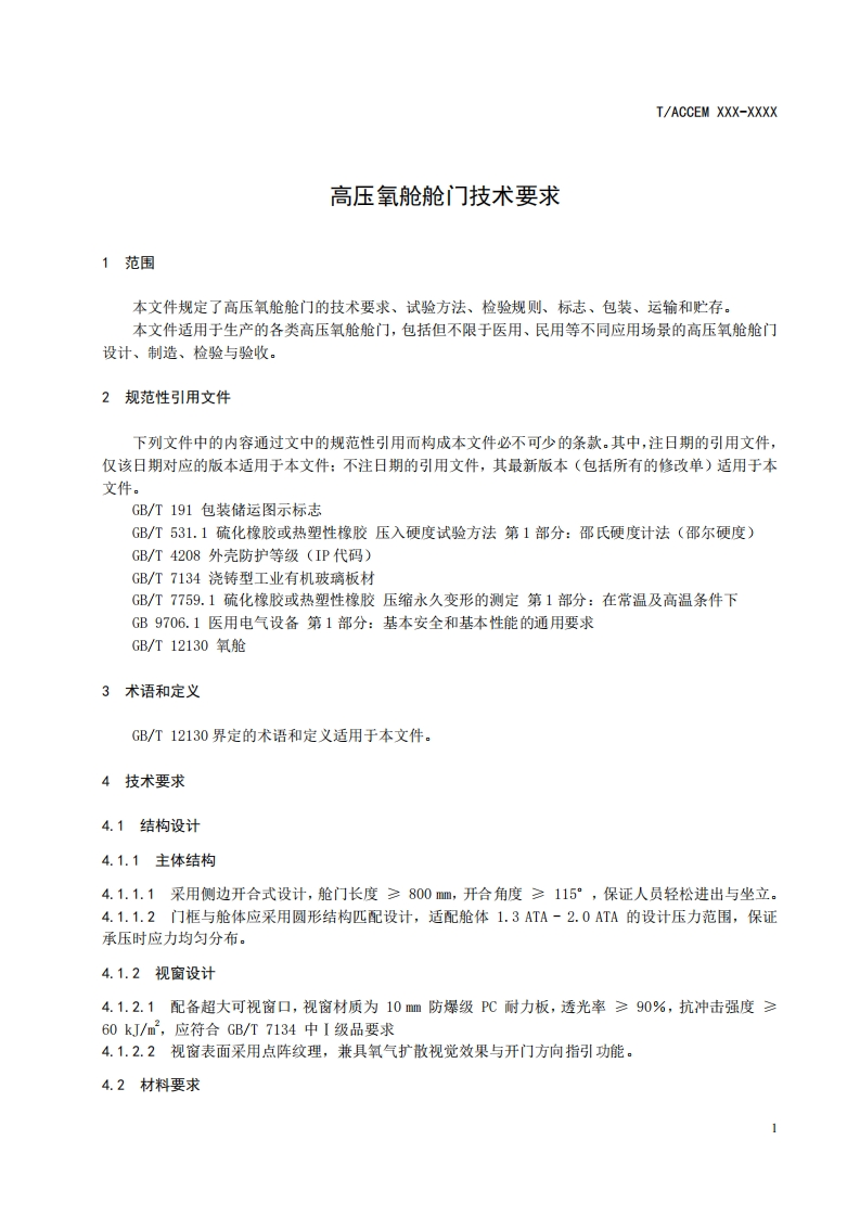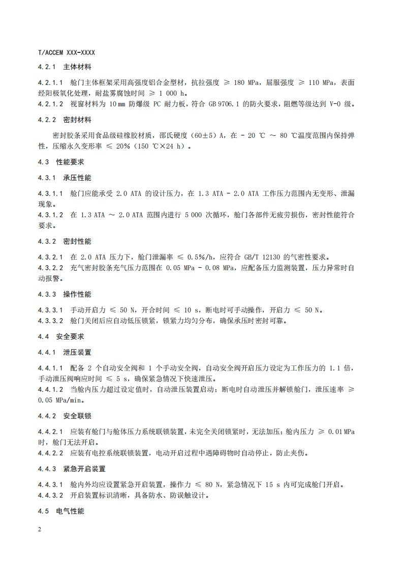 高压氧舱舱门技术要求Technicalrequirementsforhyperbaricoxygenchamberdoor348072@abc5天前发布关注私信0.22MB8页025高压氧舱舱门技术要求Technicalrequirementsforhyperbaricoxygenchamberdoor此内容为付费资源,请付费后查看¥19¥23黄金会员免费钻石会员免费立即购买您当前未登录!建议登陆后购买,可保存购买订单付费资源 第1页 / 共8页 第2页 / 共8页 第3页 / 共8页 第4页 / 共8页 第5页 / 共8页 试读已结束,还剩3页,您可下载完整版后进行离线阅读 THE END标准规范 文本预览 1C511.040.60CCS C 30IACCEM团体标准T/ACCEM XXXX-XXXX高压氧舱舱门技术要求Technical requirements for hyperbaric oxygen chamber door(征求意见稿)20XX-Xx-XX发布20XX-XX-XX实施中国商业企业管理协会发布 查看更多 收起部分 喜欢就支持一下吧收藏