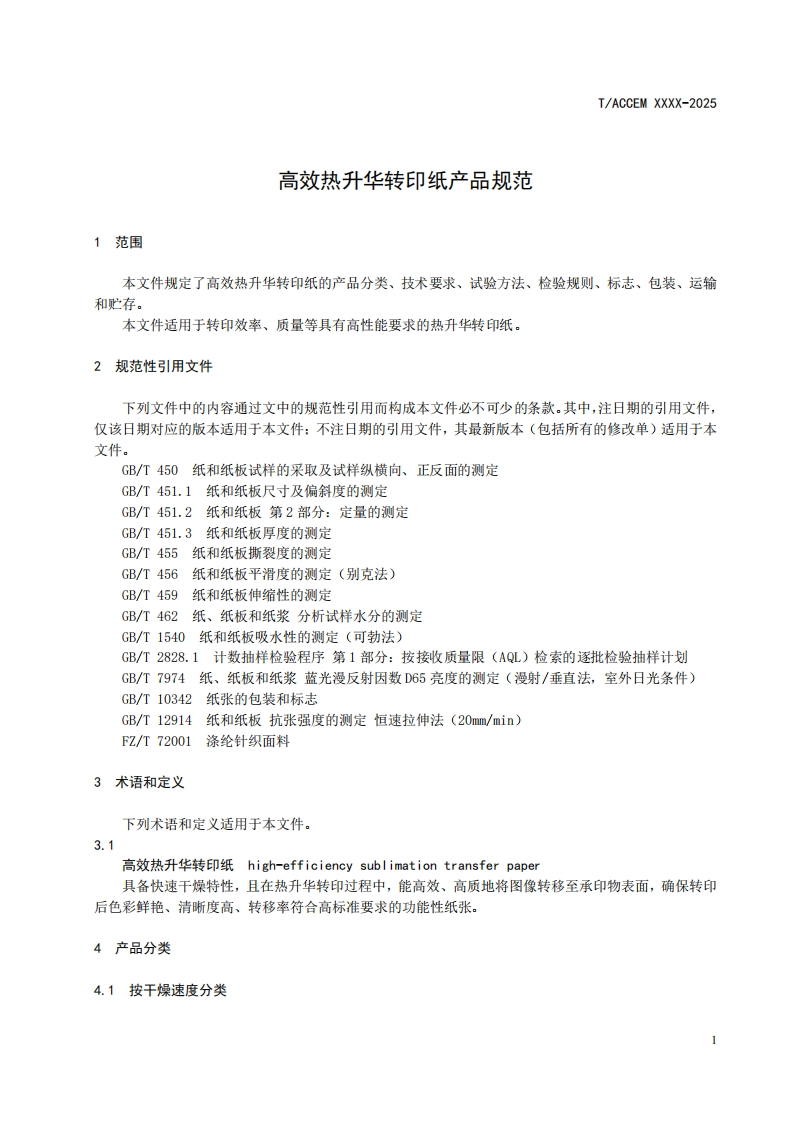 高效热升华转印纸产品规范Productspecificationforhigh-efficiencythermalsublimationtransferpaper348072@abc5天前发布关注私信1.19MB12页047高效热升华转印纸产品规范Productspecificationforhigh-efficiencythermalsublimationtransferpaper此内容为付费资源,请付费后查看¥19¥23黄金会员免费钻石会员免费立即购买您当前未登录!建议登陆后购买,可保存购买订单付费资源 第1页 / 共12页 第2页 / 共12页 第3页 / 共12页 第4页 / 共12页 第5页 / 共12页 试读已结束,还剩7页,您可下载完整版后进行离线阅读 THE END标准规范 文本预览 ICS85.060CCS Y 32ACCEM团体标准T/ACCEM XXXX-2025高效热升华转印纸产品规范Product specification for high-efficiency thermal sublimation transfer paper(征求意见稿)2025-XX-XX发布2025-XX-XX实施中国商业企业管理协会发布 查看更多 收起部分 喜欢就支持一下吧收藏