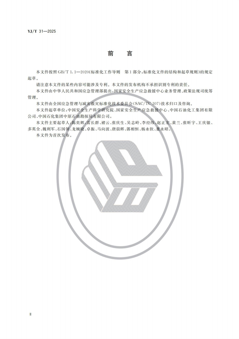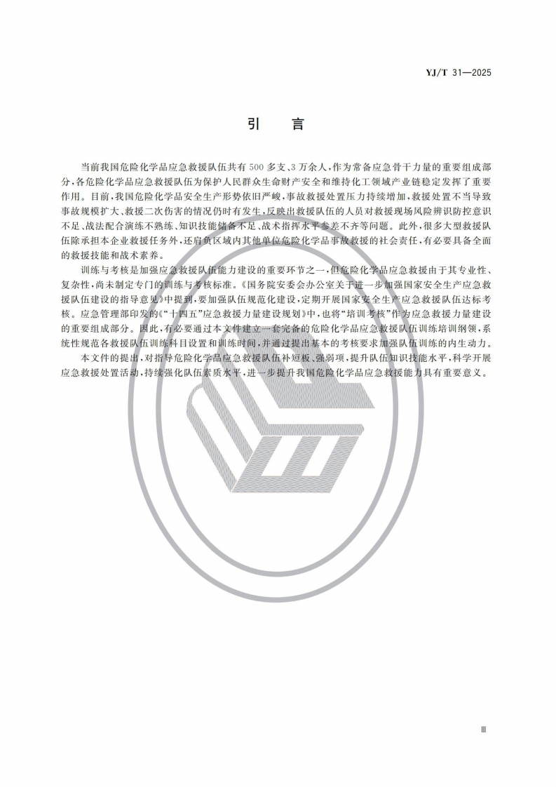 危险化学品应急救援队伍训练大纲及考核要求Trainingsyllabusandtestingrequirementsforhazardouschemicalsemergencyresponseteam348072@abc4天前发布关注私信4.25MB18页049危险化学品应急救援队伍训练大纲及考核要求Trainingsyllabusandtestingrequirementsforhazardouschemicalsemergencyresponseteam此内容为付费资源,请付费后查看¥9.9¥19黄金会员免费钻石会员免费立即购买您当前未登录!建议登陆后购买,可保存购买订单付费资源 第1页 / 共18页 第2页 / 共18页 第3页 / 共18页 第4页 / 共18页 第5页 / 共18页 试读已结束,还剩13页,您可下载完整版后进行离线阅读 THE END标准规范 文本预览 ICS13.100CCS G 09YJ中华人民共和国应急管理行业标准YJ/T31-2025危险化学品应急救援队伍训练大纲及考核要求Training syllabus and testing requirements for hazardous chemicalsemergency response team2025-04-17发布2025-10-18实施中华人民共和国应急管理部发布 查看更多 收起部分 喜欢就支持一下吧收藏