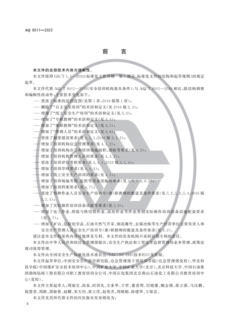 安全生产培训机构基本条件Basicconditionsofworksafetytraininginstitutions348072@abc4天前发布关注私信1.82MB8页029安全生产培训机构基本条件Basicconditionsofworksafetytraininginstitutions此内容为付费资源,请付费后查看¥9.9¥19黄金会员免费钻石会员免费立即购买您当前未登录!建议登陆后购买,可保存购买订单付费资源 第1页 / 共8页 第2页 / 共8页 第3页 / 共8页 第4页 / 共8页 第5页 / 共8页 试读已结束,还剩3页,您可下载完整版后进行离线阅读 THE END标准规范 文本预览 ICS13.100CCS C 75AQ中华人民共和国安全生产行业标准AQ8011一2023代替AQ/T8011一2016安全生产培训机构基本条件Basic conditions of work safety training institutions2023-12-20发布2024-07-01实施中华人民共和国应急管理部发布 查看更多 收起部分 喜欢就支持一下吧收藏