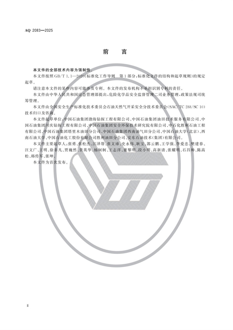 陆上石油天然气钻井安全规范Safetyspecificationforonshorepetroleumandnaturalgasdrilling348072@abc5天前发布关注私信4.31MB14页039陆上石油天然气钻井安全规范Safetyspecificationforonshorepetroleumandnaturalgasdrilling此内容为付费资源,请付费后查看¥9.9¥19黄金会员免费钻石会员免费立即购买您当前未登录!建议登陆后购买,可保存购买订单付费资源 第1页 / 共14页 第2页 / 共14页 第3页 / 共14页 第4页 / 共14页 第5页 / 共14页 试读已结束,还剩9页,您可下载完整版后进行离线阅读 THE END标准规范 文本预览 ICS13.100CCS E 09AQ中华人民共和国安全生产行业标准AQ2083-2025陆上石油天然气钻井安全规范Safety specification for onshore petroleum and natural gas drilling2025-04-17发布2025-10-18实施中华人民共和国应急管理部发布 查看更多 收起部分 喜欢就支持一下吧收藏