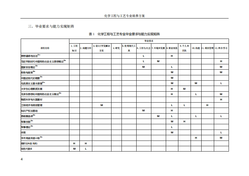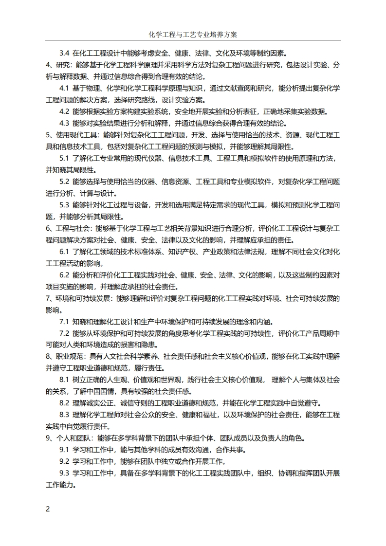 化学工程与工艺专业培养方案2020版化学工程与工艺专业培养方案(2022级)一、专业培养目标培养德智体美劳全面发展,具有扎实的数学、物理、化学及化工知识基础,具有分析和解决复杂化学工程问题的基本能力,了解化学工程与工艺专业及相关领域国内外发展趋势,具有良好的人文素质、职业操守、团队精神、社会责任、创新意识和国际视野,具有自主终身学习、适应科技和产业发展的能力,具有研究开发和设计化工尤其精细化工领域新产品、新工艺的能力,具有团队协作和组织管理能力的一流工程技术人才和社会主义建设者及接班人。5年左右的毕业生,能够达到以下职业素养和专业能力:(1)具有良好的人文素质、工程职业道德和社会责任感;(2)能综合运用专业知识,针对复杂化学工程问题进行分析、综合,提出创新性解决方案;(3)能设计开发精细化学品、能够在化工领域设计、研究、开发并实施新工艺:(4)能从法律、伦理、社会、环境、安全和经济等角度管理多学科的化工项目:(5)有职场竞争力,适应独立和团队工作环境,有终身学习、专业发展和组织领导能力。二、毕业要求通过学习,学生毕业前应达到如下要求:1、工程知识:能够将数学、物理、化学、工程基础和化工专业知识用于解决复杂工程问题。1.1掌握数学、物理、化学、化学工程基础知识,具备利用科学语言表达复杂化学工程问题的能力。1.2能对化工过程具体对象的参数建立数学模型并计算求解。1.3能够将化学工程知识和数学模型方法用于推演、分析化学工程问题。1.4能够将化学工程知识和数学模型方法用于比较与综合化学工程问题的解决方案。2、问题分析:能够应用数学、物理、化学及化工的基本原理,识别、表达、并通过文献查询分析复杂化学工程问题,以获得有效结论。2.1能运用化学工程科学原理和知识,识别和判断复杂工程问题的关键环节。2.2能基于化学工程科学原理和数学模型方法正确表达复杂化学工程问题。2.3能认识到解决问题有多种方案,通过文献调研,选择寻求可替代的解决方案,并能运用化学工程与工艺基本原理和知识,分析过程的影响因素,获得有效结论。3、设计/开发解决方案:能够设计针对复杂化学工程问题的解决方案,设计满足特定需求的化工系统、化单元(部件)或工艺流程,并能够在设计环节中体现创新理念,考虑社会、健康、安全、法律、文化以及环境等因素。3.1掌握化学工程设计和化工产品开发全周期、全流程的基本设计/开发方法和技术,了解影响设计目标和技术方案的各种因素。3.2能够针对特定的生产需求,完成化工单元和部件的设计3.3能够开展化工系统或工艺流程设计,在设计中体现创新意识。