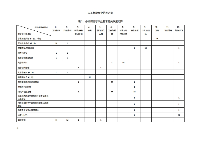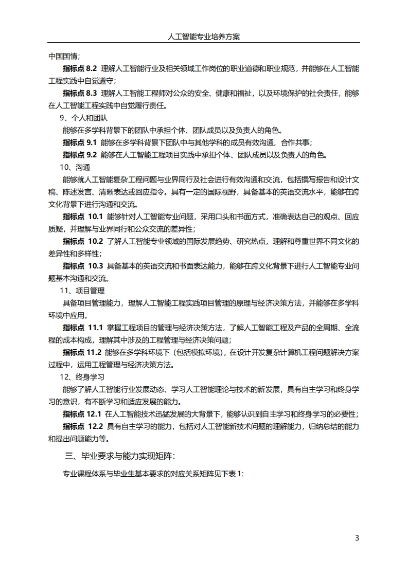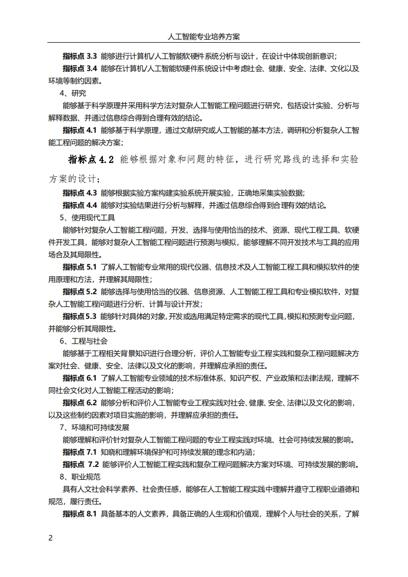 人工智能转业培养方案人工智能专业培养方案一、专业培养目标:培养富有社会责任感和创新精神、基础理论扎实、专业知识宽厚、能系统地应用人工智能的基本理论、知识、技能与方法分析和解决复杂工程问题的高级工程型专业技术人才;具备良好的团队沟通能力和一定的领导才能,具备国际化视野和跨文化的交流、竞争与合作能力;具有终身学习能力,在工作岗位上能够通过自学方式进一步丰富和加深对专业知识的学习和理解,自我提升工作能力。毕业的学生能够引领科技创新和人工智能产业发展,服务于国防建设与经济社会发展,成为人工智能科学研究和技术工程兼顾的高素质创新人才和卓越工程人才。经过五年左右的工作实践,能独立承担重要科研项目或复杂人工智能工程项目任务,成为项目团队的核心成员或团队负责人。二、毕业要求:根据人工智能转业特点及发展定位,基于本专业的培养目标,制定的毕业要求共有如下12条。对于每一项毕业要求,进行指标点的分解,得到35个指标点:1、工程知识能够将数学、自然科学、信息科学基础和人工智能转业知识应用于解决复杂计算机工程问题。指标点1.1能够运用数学、自然科学、信息科学基础和人工智能转业相关专业知识表述复杂计算机工程问题;指标点1.2能够针对具体的对像建立数学模型,并根据模型进行计算机复杂工程问题的求解;指标点1.3能够将相关知识和数学模型用于推演、分析复杂人工智能工程问题;指标点1.4能够将相关知识和数学模型用于比较和综合复杂人工智能工程问题的解决方案。2、问题分析能够应用数学、自然科学、计算机科学与技术的基本原理,识别、表达、并通过文献研究分析复杂人工智能工程问题,以获得有效结论,指标点2.1能够运用相关科学原理,识别和判断复杂人工智能工程问题的关键环节;指标点2.2能够基于相关科学原理和数学模型方法正确表达复杂人工智能工程问题;指标点23能够借助文献研究等手段,寻求复杂人工智能工程问题的多种可替代解决方案;指标点2.4能够通过运用基本原理,借助文献研究等方法,分析复杂人工智能工程问题的影响因素并获得有效结论。3、设计/开发解决方案能够设计解决复杂人工智能工程问题的技术方案,能够设计并实现满足特定需求的人工智能系统或模块,并能够在设计环节中体现创新意识,考虑社会、健康、安全、法律、文化以及环境等因素。指标点3.1掌握人工智能工程设计与产品开发的全周期、全流程的基本设计/开发技术和方法,了解影响设计目标和技术方案的各种因素;指标点3.2能够针对特定需求,完成计算机/人工智能软硬件部件或模块的需求分析和设计:1