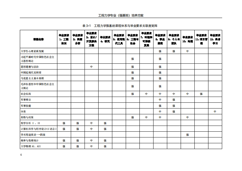 工程力学专业(强基班)培养方案工程力学专业(强基班)培养方案一、专业培养目标:力学是工程科学的基础,工程力学专业旨在培养具备国际视野、具有坚实的现代力学理论基础和优异的工程创新能力,能够从工程实践中提炼共性力学问题并形成重要理论,指导工程实现原理和关键技术突破,为学科发展和科技创新做出重大贡献,能够在新材料、先进制造、智能科技和国家安全等关键领域从事相关科学研究、技术开发和工程设计的工程科学家和卓越领军人才。二、毕业要求:2.1本专业毕业要求:1.工程知识:能够将数学、自然科学、工程基础和专业知识用于解决复杂工程问题。2.问题分析:能够应用数学、自然科学和工程科学的基本原理,识别、表达、并通过文献研究分析复杂工程问题,以获得有效结论。2.1能够应用工程力学的基本原理,识别、表达复杂工程问题中的力学问题。2.2掌握工程力学专业重要文献资料的来源和获取方法。2.3通过调查与研究,能够分析复杂工程力学问题,获得有效结论。3.设计开发解快方案:能够设计针对复杂工程问题的解决方案,设计满足特定需求的系统、单元(部件)或工艺流程,并能够在设计环节中体现创新意识,考虑社会、健康、安全、法律、文化以及环境等因素。3.1了解工程力学技术发展历史中重大技术突破的背景与影响。3.2掌握基本的创新原理和方法,具有追求创新的态度和意识。3.3具有综合运用理论和技术手段设计系统和过程的能力,设计过程中能够综合考虑经济、环境、法律、安全、健康、伦理等制约因素。4,研究:能够基于科学原理并采用科学方法对复杂工程问题进行研究,包括设计实验、分析与解释数据、并通过信息综合得到合理有效的结论。4.1熟悉工程力学材料特性和各类物理现象、规律,具有应用材料、力学、物理、电工电子等基础知识进行设计和实施实验的能力,并能够对实验结果进行分析。4.2熟悉工程力学机械相关零件、结构、装置、系统的工作原理,具备对其特征参数和运行参数进行测量和测试的能力,并能够对实验结果进行分析。4.3熟悉各类机械设备、装置、测试仪器的工作原理、技术参数和适用范围,具备对工程力学系统过程的控制参数、状态参数和工艺结果进行测量和测试的能力,并能够对实验结果进行分析。5.。使用现代工具:能够针对复杂工程问题,开发、选择与使用恰当的技术、资源、现代工程工具和信息技术工具,包括对复杂工程问题的预测与模拟,并能够理解其局限性。5.1掌握工程力学中数值模拟方法的原理与基本方法。5.2能够开发软件来预测与模拟复杂工程力学问题。5.3熟悉CAD/CAE相关软件的使用,并理解其局限性。6.工程与社会:能够基于工程相关背景知识进行合理分析,评价专业工程实践和复杂工程问题1