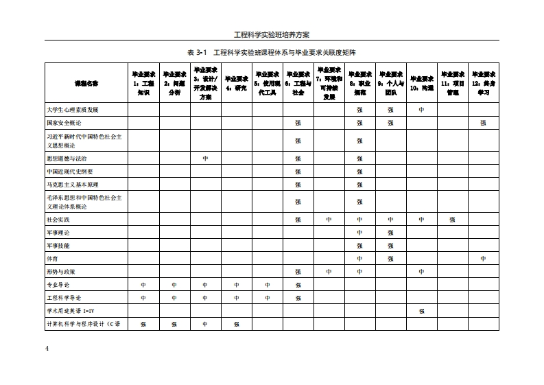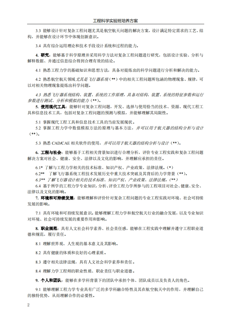 工程科学实验班培养方案工程科学实验班培养方案(*,针对力学专业方向要求;林针对飞行器设计专业方间要求)一、专业培养目标:航空航天科技发展水平是一个国家整体科技水平和综合国力的体现。力学作为上述工程科技的基础学科,不仅要解决我国航空航天中面临的重大工程科学问题,更要推动我国工程科技的发展从“引进-吸收-再创新”到“原始创新”的根本性转变,实现原理和方法的突破。为实现上述目标设立的工程科学实验班旨在培养以航空航天,尤其飞行器设计为背景,培养力学基础扎实,熟悉航空航天工程背景的高层次专门人才。本专业学生毕业后5年左右,预期达到以下目标:(1)具有高尚的道德和人文科学素养:(2)具有坚实的力学基础,并具有分析和解决飞行器系统中相关复杂工程问题的能力:(3)在飞行器设计及其相关专业领域担任技术骨干或研究型工程师等重要角色(*):(4)具有良好的团队组织协调、沟通表达及竞争与合作能力:(5)具有终身学习的意识,及自主学习和适应发展的能力:(6)具有国际交流、合作能力和为当地、本国、全球社会服务的能力。二、毕业要求:2.1本专业毕业要求:1.工程知识:能够将数学、自然科学、工程基础和专业知识用于解决复杂工程问题。1.1了解航空航天尤其是飞行器设计领域(*)的工程背景.12具有融合力学思想,对工程领域尤其是飞行器设计领域(*)的相关问题进行建模、表征、解释、分析的能力1.3能够将数学、自然科学、工程基础和力学专业知识用于解决相关复杂工程问题。2.问思分析:能够应用数学、自然科学和工程科学的基本原理,识别、表达、并通过文献研究分析复杂工程问题,以获得有效结论。2.1具有将工程实际问题转化为理论模型的能力,可以分析和解决航空航天领域的复杂问题。2.2掌握工程力学及航空航天领域重要文献资料的来源和获取方法。2.3通过调查与研究,能够分析复杂工程问题,获得有效结论。3.设计开发解决方案:能够设计针对复杂工程问题的解决方案,设计满足特定需求的系统、单元(部件),并能够在设计环节中体现创新意识,考虑社会、健康、安全、法律、文化以及环境等因素。3.1了解工程力学技术发展和航空航天领域**)发展历史中重大技术突破的力学背景与影响。3.2掌握航空航天领域的创新设计原理和方法,具有追求创新的态度和意识()。1