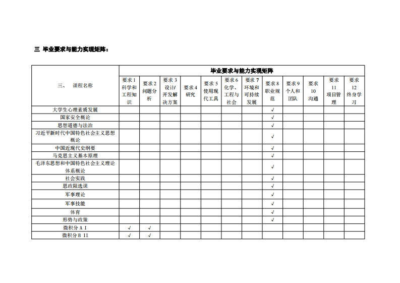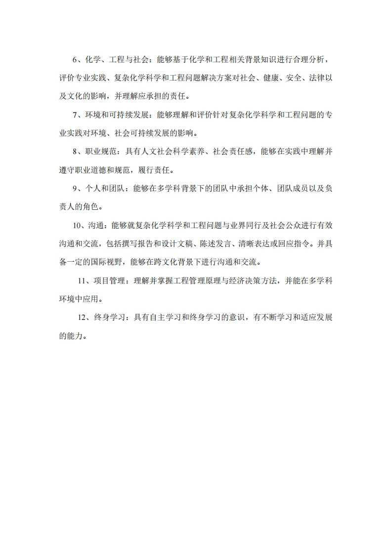 应用化学机械工程双学士学位项目培养方案专业培养目标:应用化学-机械工程双学士学位项目,以培养德智体美劳全面发展的社会主义建设者和接班人为目标,立足纳米科学与技术和微纳加工制造方向的国际研究前沿,面向国家相关领域的战略需求,坚持理工融合创新发展,培养具有高度的社会责任感和良好的科学、文化素养,系统扎实地掌握数理基础、化学基础知识、微纳加工基本理论和基本技能,富有创新意识和实践能力的纳米科学与技术的专业人才。同时注重人才个性化发展,培养能在纳米材料化学、纳米能源化学、纳米生物及医用化学、纳米传感、微纳加工制造、芯片化学机械加工等方向及相关领域从事科学研究、高技术开发研究、教学和管理等工作的宽口径复合型、高水平专业型和拔尖创新型人才。二、毕业要求:通过学习,学生毕业前应达到如下要求:1、科学和工程知识:能够将数学、自然科学、工程基础和专业知识用于解决复杂化学科学和工程问题。2、问题分析:能够应用数学、自然科学和工程科学的基本原理,识别、表达、并通过文献研究分析复杂化学科学和工程问题,以获得有效结论:3、设计开发解决方案:能够设计针对复杂化学科学和工程问题的解决方案,设计满足特定需求的系统、单元(部件)或工艺流程,并能够体现创新意识,考虑社会、健康、安全、法律、文化以及环境等因素。4、研究:能够基于科学原理并采用科学方法对复杂化学科学和工程问题进行研究,包括设计实验、分析与解释数据、并通过信息综合得到合理有效的结论。5、使用现代工具:能够针对复杂化学科学和工程问题,开发、择与使用恰当的技术、资源、现代工程工具和信息技术工具,包括对复杂化学科学和工程问题的预测与模拟,并能够理解其局限性。