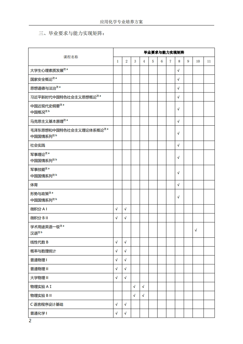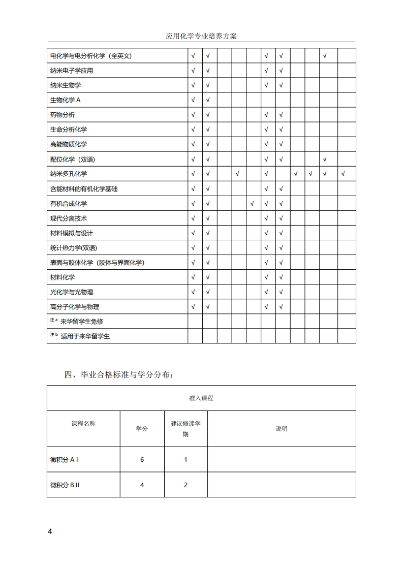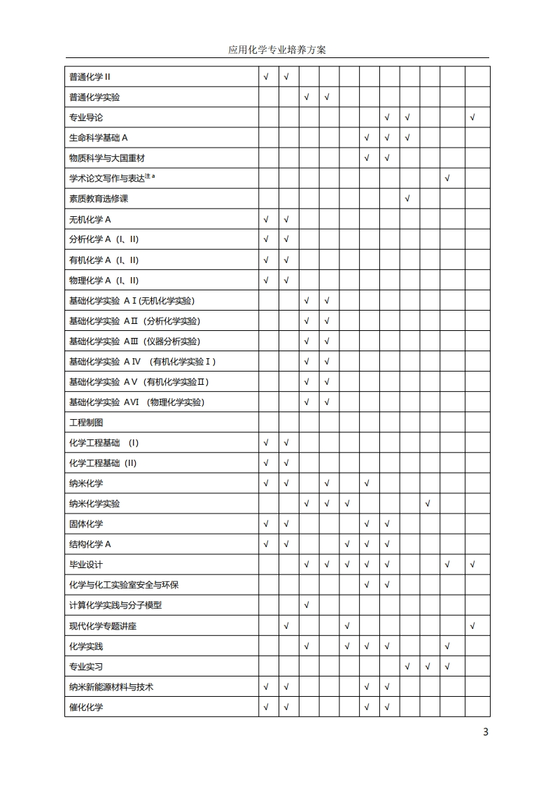 应用化学专业培养方案应用化学专业培养方案一、专业培养目标:应用化学专业,以培养德智体美劳全面发展的人才为目标,立足纳米科学与技术方向的国际研究前沿,坚持理工融合创新发展,培养具有高度的社会责任感和良好的科学、文化素养,系统扎实地掌握数理基础、化学基础知识、基本理论和基本技能,富有创新意识和实践能力的纳米科学与技术的专业人才。同时注重人才个性化发展,培养能在纳米材料化学、纳米能源化学、纳米高能量物质化学、纳米生物及医用化学等方向及相关领域从事科学研究、高技术开发研究、教学和管理等工作的宽口径复合型、高水平专业型和拔尖创新型人才。二、毕业要求:通过学习,学生毕业前应达到如下要求:1、能够将数学、自然科学和专业知识用于解决化学学科科学问题。2、能够应用数学、自然科学和工程科学的基本原理,识别、表达、并通过文献研究分析复杂化学学科科学问题,以获得有效结论:3、能够设计针对化学科学问题的解决方案,并能够体现创新意识,考虑社会、健康、安全、法律、文化以及环境等因素。4、能够基于科学原理并采用科学方法对化学科学问题进行研究,包括设计实验、分析与解释数据、并通过信息综合得到合理有效的结论。5、能够针对化学科学问题,开发、选择与使用恰当的技术、资源、现代信息工具,包括对化学科学问题的预测与模拟,并能够理解其局限性。6、能够基于化学相关背景知识进行合理分析,评价化学实践和复杂科学问题解决方案对社会、健康、安全、法律以及文化的影响,并理解应承担的责任。7、能够理解和评价针对化学科学问题的专业实践对环境、社会可持续发展的影响。8、具有人文社会科学素养、社会责任感,能够在实践中理解并遵守职业道德和规范,履行责任。9、能够在多学科背景下的团队中承担个体、团队成员以及负责人的角色。10、能够就化学科学问题与业界同行及社会公众进行有效沟通和交流,包括撰写报告和设计文稿、陈述发言、清晰表达或回应指令。并具备一定的国际视野,能够在跨文化背景下进行沟通和交流。11、具有自主学习和终身学习的意识,有不断学习和适应发展的能力。