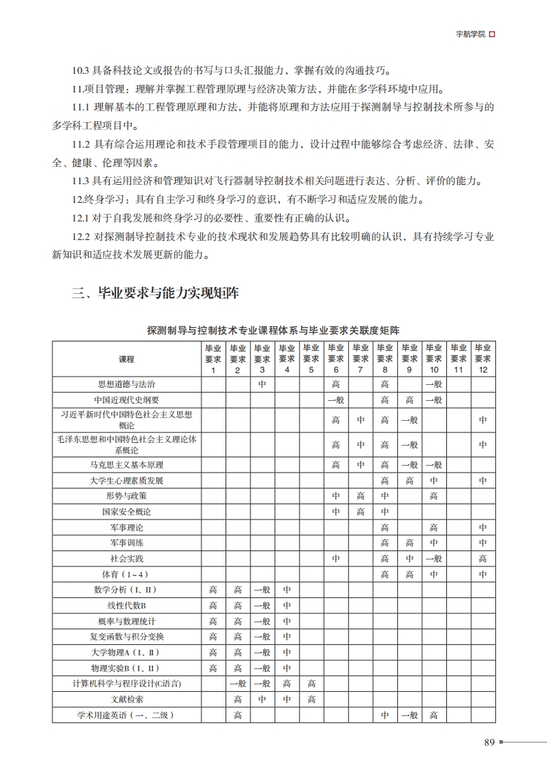 得北京理工大学北惊理工大学本科教学培养方案探测制导与控制技术专业培养方案一、专业培养日标:以“胸怀壮志、明德精工、创新包容、时代担当”的校训为指引,培养适应社会主义现代化建设需要,德、智、体、美等全面发展,基础扎实、理工结合、素质全面、工程实践能力和创造能力强的研究发展型人才。通过本专业的学习,使学生具备坚实的数学与物理基础知识,能够系统地掌握电子技术、控制理论、飞行器探测、制导与控制、导航定位等宽广的专业知识,同时培养学生进行系统分析、设计与开发的科学研究能力,具有国际化视野,思想素质、人文素养和工程素质过硬,为学生毕业后从事飞行器探测、制导与控制系统的理论研究、系统分析、设计与开发、仿真检测以及技术管理等工作和进一步深造打下坚实的基础。本专业面向未来航空宇航科学与技术学科发展,适应国家发展战略需要,培养多元化、创新型的领军领导人才,使本专业毕业生具有深厚的数理基础和宽广的专业基础知识;具备创新精神、国际视野与系统思维,能够综合运用数理工多学科专业知识,解决复杂工程问题。本专业学生毕业后5年左右,预期达到以下目标:(1)具有良好的道德素质和人文科学素养:(2)能够综合运用所学专业知识解决探测制导与控制技术领域的具体问题,成为专业技术骨干;(3)具有良好的团队组织协调、沟通表达及竞争与合作能力;(4)能够胜任专业团队合作中的角色,具备技术带头人的潜力和未来管理者的领导能力:(5)具有终身学习意识和能力,不断进行知识的更新,以适应社会和科技发展的需要;(6)具有国际视野和国际交流合作能力,能在本专业范围内与国际同行进行学术交流。二、毕业要求1.工程知识:能够将数学、自然科学、工程基础和专业知识综合运用于解决复杂工程问题。1.1掌握自然科学和工程基础知识,能够深入理解和认识探测制导与控制领域复杂工程问题。12能够运用数学、物理和专业知识对探测制导与控制领域复杂工程问题进行抽象建模和分析。1.3能够将专业知识和数学建模方法用于探测制导与控制技术专业工程问题解决方案的比较与综合。2问题分析:能够应用数学、自然科学和工程科学的基本原理,识别、表达、并通过文献研究分■86