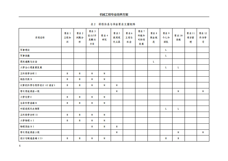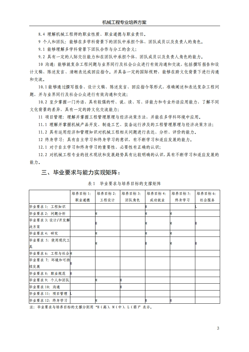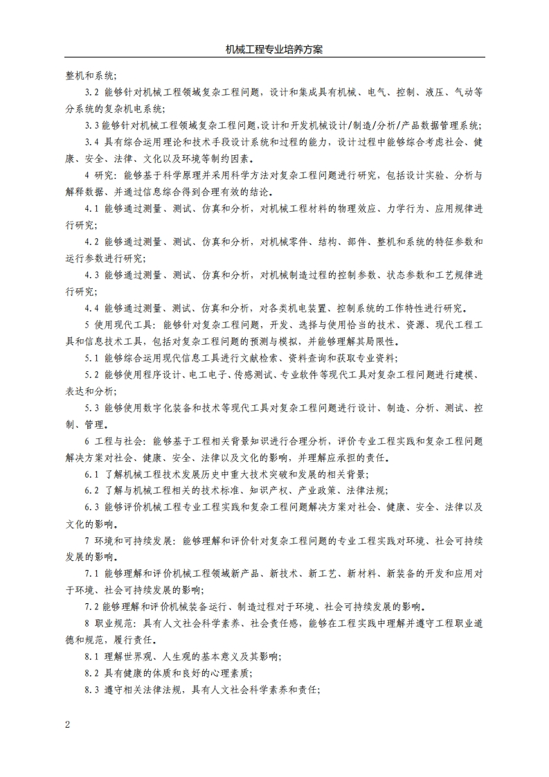机械工程专业培养方案机械工程专业培养方案一、专业培养目标:面向智能制造、工业强基、高端装备制造、工业机器人等新技术集中交叉地带的发展趋势和重点领域,培养德智体全面发展,掌握机械工程领域的专业基础知识、研究和应用能力,具有工程创新意识、工程实践能力、组织协调能力、国际化视野,形成科学素养、工程素养和人文素养,能够在装备制造、汽车运载、工程机械、能源动力、机床工具等国家重点行业与航天、航空、船粕、兵器、军用电子等国防科技工业关键岗位从事产品设计、制造、科学研究、技术开发与生产管理的高级工程技术人才,本专业学生毕业后5年左右,预期达到以下目标:(1)具有高尚的道德和人文科学素养;(2)能够有效地运用工程技术规范设计机械工程技术解决方案;(3)具有良好的团队组织协调、沟通表达及竞争与合作能力:(4)在机械工程及其相关专业领域担任技术骨干或重要角色;(5)具有终身学习的意识,及自主学习和适应发展的能力;(6)具有国际交流、合作能力和为当地、本国、全球社会服务的能力,二、毕业要求1工程知识:能够将数学、自然科学、工程基础和专业知识用于解决复杂工程问题。1.1能够运用数学知识对机械工程领域复杂工程问题进行建模、表达、分析、计算、求解;1.2能够运用自然科学知识对机械工程领域复杂工程问题进行建模、表达、分析、解释;1.3能够运用工程基础知识对机械工程领域复杂工程问题进行建模、表达、分析、解释;1.4能够运用专业知识对机械工程领域复杂工程问题进行建模、表达、分析、解释,2问题分析:能够应用数学、自然科学和工程科学的基本原理,识别、表达、并通过文献研究分析复杂工程问题,以获得有效结论,2.1能够应用数学、自然科学和工程科学的基本原理对机械零件、结构、系统、整机的组成和原理进行分析;2.2能够应用数学、自然科学和工程科学的基本原理对机械零件、结构、系统、整机的工作特性进行分析;2.3能够应用数学、自然科学和工程科学的基本原理对复杂机电系统的电气、控制、液压、气动分系统的工作原理、技术参数、工作特性进行分析;2.4能够应用数学、自然科学和工程科学的基本原理对机械制造工艺和过程的现象、原理、机理、规律进行分析。3设计/开发解决方案:能够设计针对复杂工程问题的解决方案,设计满足特定需求的系统、单元(部件)或工艺流程,并能够在设计环节中体现创新意识,考虑社会、健康、安全、法律、文化以及环境等因素,3.1能够针对机械工程领域复杂工程问题,设计和开发满足特定需求的机械零件、结构、部件、