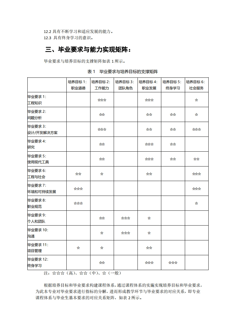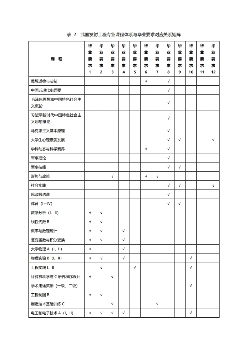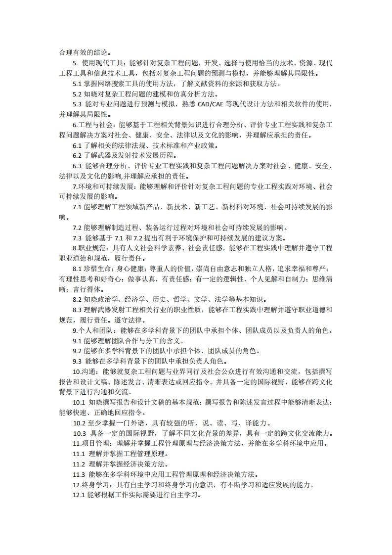 武器发射工程专业培养方案专业培养目标:培养具备科学素养和人文精神,适应国民经济与社会发展需要,系统掌握数学、力学、机械、控制、计算机等基础知识以及发射系统设计、发射动力学等专业基础知识,具有国际视野、创新精神、创业意识及基本的创新创业能力,能够在国防科技工业领域和国民经济领域从事系统设计、技术研发、产品制造、试验测试、技术管理等方面工作的专门人才。本专业学生毕业后5年左右,预期达到以下目标:(1)具有高尚的道德和人文科学素养:(2)能够有效地运用基础理论和专业知识进行武器发射系统的设计、研发和优化工作:(3)具有良好的团队组织协调、沟通表达及竞争与合作能力:(4)在武器发射工程及其相关专业领域担任技术骨干或重要角色:(5)具有终身学习的意识及自主学习和适应发展的能力:(6)具有国际交流、合作能力和为当地、本国、全球社会服务的能力。二、毕业要求:本科毕业生应具备以下方面的知识和能力:1.工程知识:能够将数学、自然科学、工程基础和专业知识用于解决工程问题。1.1能够运用所学数学知识对武器发射系统相关物理现象建立数学模型。1.2能够运用所学物理知识对武器发射系统进行建模和分析。1.3能够运用所学工程基础和专业知识进行发射装置的设计和分析。2.问题分析:能够应用数学、自然科学和工程科学的基本原理,识别、表达、并通过文献研究分析复杂工程问题,以获得有效结论。2.1具有运用数学知识和自然科学知识对工程问题进行建模、表达、分析和求解的能力。2.2能够运用工程制图基础知识进行工程识图、绘图和表达。2.3掌握从文献中获取信息的基本方法,并具有归纳、总结和分析的能力。3.设计/开发解决方案:能够设计针对复杂工程问题的解决方案,设计满足特定需求的系统、单元(部件)或工艺流程,并能够在设计环节中体现创新意识,考虑社会、健康、安全、法律、文化以及环境等因素。3.1了解系统工程的原理和方法,掌握机械设计、材料、电工电子技术、计算机、控制等方面的基础知识,能够设计针对武器发射工程问题的解决方案,具有发射系统零件、结构和装置设计的能力。3.2了解武器发射装置零部件的制造原理,具有制造工艺分析和设计的能力。3.3具有创新意识,并能在设计过程中体现,设计过程中能够综合考虑社会、健康、安全、法律、文化以及环境等因素。4.研究:能够基于科学原理并采用科学方法对复杂工程问题进行研究,包括设计实验、分析与解释数据、并通过信息综合得到合理有效的结论。4.1熟悉各类物理规律和现象,熟练掌握基本物理实验方法。4.2知晓测试原理、测试方法和测试仪器,具有设计和实施实验的能力。4.3了解数据分析的基本方法,能够对实验数据进行分析和解释,并通过信息综合得到