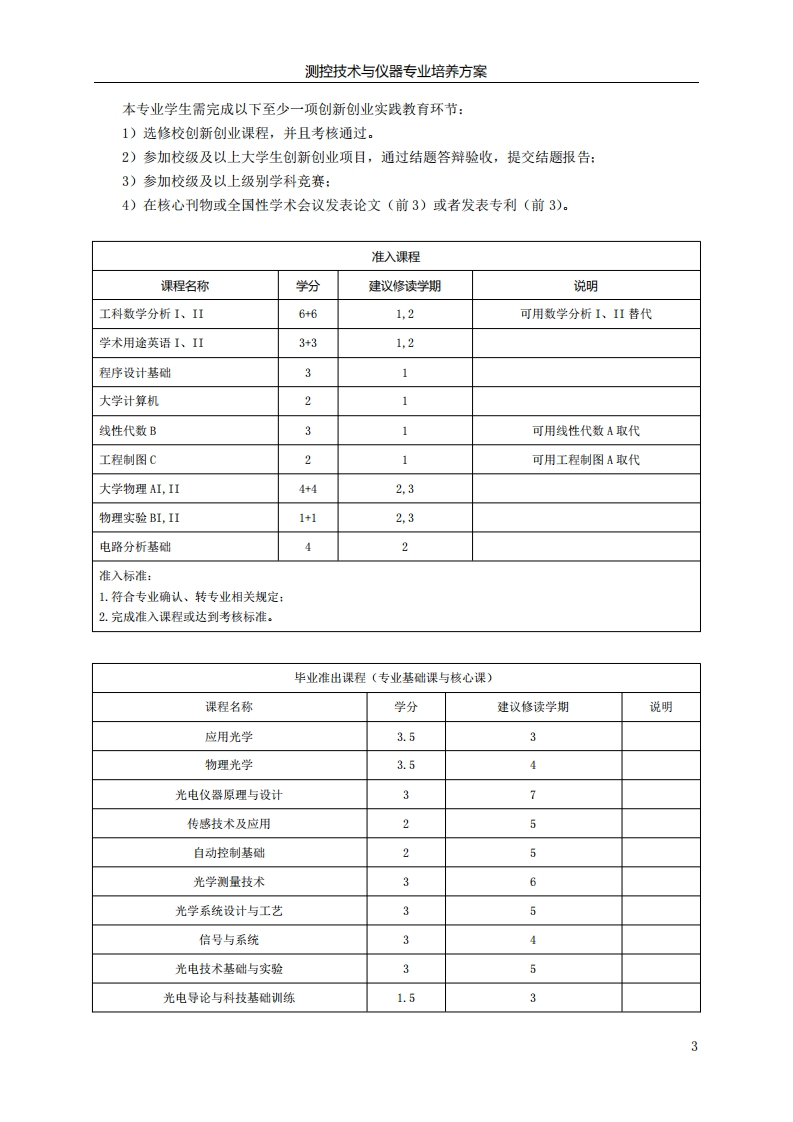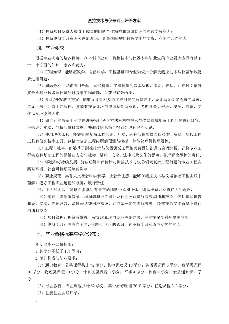 测控技术与仪器专业培养方案2020级测控技术与仪器专业培养方案一、学院简介北京理工大学光电学院成立于1953年,学院学科特色鲜明,办学实力雄厚,学术成果显著。学院现有教职工182人,其中中国科学院院士1名、中国工程院院士2名,国家级人才计划入选者10余名,国家四青人才7名,百千万人才工程国家级入选者2名,教育部新(跨)世纪高层次优秀人才13名,北京市教学名师4名:教育部“长江学者与创新团队发展计划”创新团队1个,科技部创新人才推进计划重点领域创新团队1个,北京市优秀教学团队1个。学院拥有光学工程和仪器科学与技术两个一级学科,其中光学工程为国家重点学科。建有光电信息科学与工程、测控技术与仪器、智能感知工程三个本科专业,光电信息科学与工程、测控技术与仪器均获评国家首批一流专业建设点、均通过全国工程教育专业认证。学院承担了一系列国家国防重大重点科研项目,近十年获得国家及省部级科技奖励二十余项。学院建有光电成像技术与系统教育部重点实验室、信息光子技术工信部重点实验室、精密光电测试仪器及技术北京市重点实验室、北京市混合现实与新型显示工程技术研究中心、工程光学国家级虚拟仿真教学实验中心、工信部实验教学示范中心、两个“国家级工程实践教育中心”、两个“北京市校外人才培养基地”、一个“工信部校企协同育人示范基地”,为培养创新人才起到重要支撑作用。二、专业简介北京理工大学“测控技术与仪器”专业成立于1953年。本专业国防特色鲜明,学科优势突出,师资力量雄厚,以光电精密测量和控制为基础,坚持“立足国防、面向全国、服务地方”的定位,以人文教育培养创新精神,以理科基础培养创新能力,以工程实践为导向培养创新思维,构建工理文交叉融合的课程教学体系,培养引领国防建设与经济社会发展的高素质创新人才。本专业己先后培养出本科毕业生3800余名,具备年招生60名以上的能力。本专业先后为国家、特别是为国防事业培养了大批专门人才,为仪器科学与技术、光学工程、电子科学与技术等学科培养输送了大批的研究生。本专业的许多毕业生己成为仪器科学与技术、光学工程等领域的学术带头人、专家、教授、管理者及业务骨干,活跃在国内众多领域的重要岗位上。三、专业培养目标培养具有强烈的社会责任感和良好的科学、文化素养,系统地掌握自然科学基础、工程基础及测量控制技术与仪器相关基本理论和专业技能,具有测控系统和仪器综合设计、实现及应用能力,能在仪器科学、测控技术与仪器及相关领域从事科学研究、技术应用、产品研发、运行管理等工作的高级专门人才。毕业后,经过5年左右的工作或学习深造,本专业毕业生应该具备:(1)具有良好的思想品质、职业道德和人文素养:(2)具备以光电技术为主线、光电信息获取、处理、传输与测控系统相互支撑的专业知识:(3)具备解决测控技术与仪器及相关领域的复杂工程问题,并依据相关政策法规及社会、环境需求,从事测控技术与仪器相关领域的系统分析与集成、设计、运行及开发的能力:1