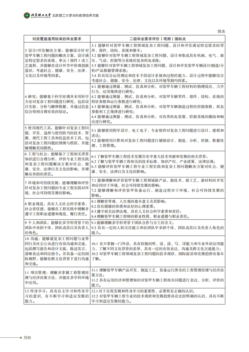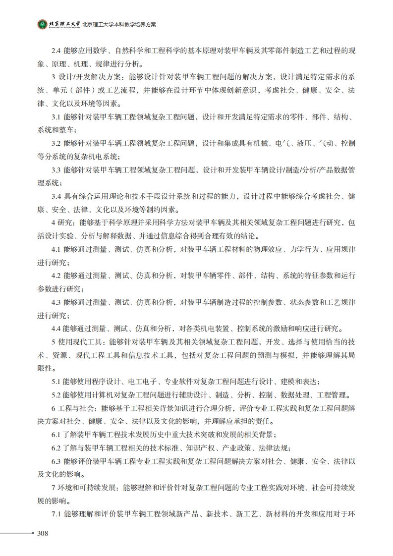 机械与车辆学院口装甲车辆工程专业培养方案一、专业培养日标:以国家安全和国防建设重大需求为导向,结合我国军用车辆及其他相关车辆行业的需求,培养德智体全面发展,具有科学素养、工程素养和人文素养,具备装甲车辆工程、车辆工程和机械工程等领域的专业基础知识、应用能力、创新意识、组织协调能力、工程实践能力,具有国际化视野和竞争力,能够在装甲车辆工程、车辆工程及机械工程等领域从事产品设计、制造、试验、科学研究和管理的国防拔尖创新型领军人才、科学家和工程师。本专业学生毕业后5年左右,预期达到以下目标:(1)具有高尚的职业道德和深厚的人文科学素养:(2)能有效运用工程技术原则提出装甲车辆工程或相关机械工程领域的技术解决方案;(3)能在跨职能团队中工作、交流并胜任领导或重要角色;(4)在与装甲车辆工程或相关专业领域内成功就业或攻读研究生学位;(5)通过继续教育或其他学习渠道不断增加知识和提升能力:(6)具有国际交流、合作能力和能为当地、本国及全球社会服务的能力。二、毕业要求:1工程知识:能够将数学、自然科学、工程基础和专业知识用于解决装甲车辆工程问题。1.1能够运用数学知识对装甲车辆工程领域的工程问题进行建模、表达、分析、计算、求解;12能够运用自然科学知识对装甲车辆工程领域的工程问题进行建模、表征、解释:13能够运用工程基础知识对装甲车辆工程领域的工程问题进行建模、表征、解释:1.4能够运用专业知识对装甲车辆工程领域的工程问题进行建模、表征、解释。2问题分析:能够应用数学、自然科学和工程科学的基本原理,识别、表达、并通过文献研究分析复杂工程问题,以获得有效结论。21能够应用数学、自然科学和工程科学的基本原理对装甲车辆的零件、部件、系统和整车的结构强度、安全服役、工作可靠性的特征参数和运行参数进行分析;22能够应用数学、自然科学和工程科学的基本原理对装甲车辆零件、部件、系统和整车的运动学、动力学等工作原理和特性进行分析:23能够应用数学、自然科学和工程科学的基本原理对复杂机电系统的电气、液压、气动、控制分系统的工作原理、技术参数、适用范围、激励和响应进行分析:307