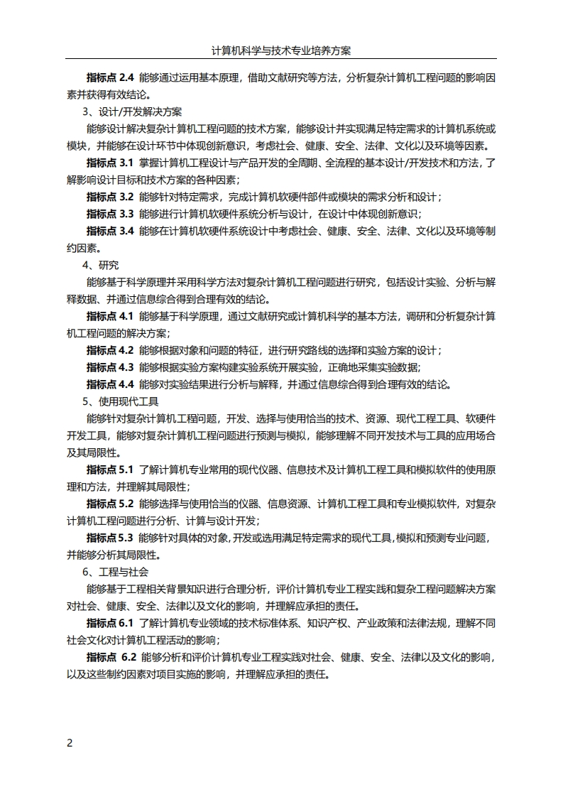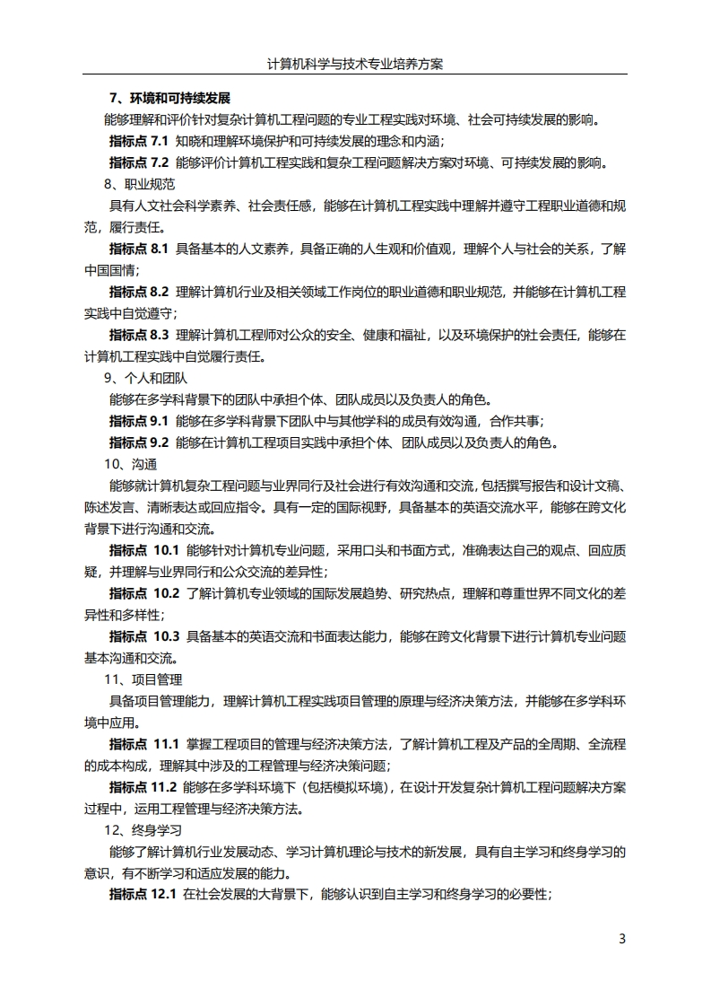 计算机科学与技术专业培养方案计算机科学与技术专业培养方案一、专业培养目标:培养具有高尚的职业道德和社会责任感,基础理论扎实,能系统地应用包括计算机硬件、软件与应用的基本理论、基本知识和基本技能与方法,工程实践能力强,分析和解决问题能力强,知识面宽广的工程型专业技术人才,具备良好的团队沟通能力和一定的领导才能,具有终身学习意识和创新意识,具备国际化视野,能够解决T领域实际复杂工程问题。毕业的学生可在科研机构、高等院校、政府机关、企事业单位等从事计算机及相关领域的工程研究、技术开发、运行维护、项目管理以及信息服务等工作。经过五年左右的工作实践,本专业培养的学生应满足合格的计算机系统工程师的基本要求,能独立承担复杂工程项目任务,成为项目团队的核心成员或团队负责人。培养目标可以具体归纳为以下几条:(1)适应国家现代化与信息化建设需要,具有高尚的职业道德和社会责任感;(2)具有扎实的数理基础,良好的科学素养与系统的专业知识,精通岗位业务,能够成为相应岗位合格的工程师;(3)工程实践能力强,分析和解决问题能力强,能够在计算机相关领域的复杂工程项目中独立承担任务;(4)具备良好的团队合作精神和组织、沟通能力,能够成为项目团队的核心成员或团队负责人:(5)具有终身学习意识,能够通过多种学习渠道增加知识和提升能力;(6)具有创新意识、国际视野和跨文化的交流、竞争与合作能力。二、毕业要求:根据计算机科学与技术专业特点及发展定位,基于本专业的培养目标,制定的毕业要求共有如下12条。对于每一项毕业要求,进行指标点的分解,得到35个指标点:1、工程知识能够将数学、自然科学、信息科学基础和计算机专业知识应用于解决复杂计算机工程问题。指标点1.1能够运用数学、自然科学、信息科学基础和计算机专业知识表述复杂计算机工程问题;指标点1.2能够针对具体的对象建立数学模型,并根据模型进行计算机复杂工程问题的求解;指标点1.3能够将相关知识和数学模型用于推演、分析复杂计算机工程问题;指标点1.4能够将相关知识和数学模型用于比较和综合复杂计算机工程问题的解决方案。2、问题分析能够应用数学、自然科学、计算机科学与技术的基本原理,识别、表达、并通过文献研究分析复杂计算机工程问题,以获得有效结论。指标点2.1能够运用相关科学原理,识别和判断复杂计算机工程问题的关键环节;指标点2.2能够基于相关科学原理和数学模型方法正确表达复杂计算机工程问题:指标点2.3能够借助文献研究等手段,寻求复杂计算机工程问题的哆种柯替代解决方案;1