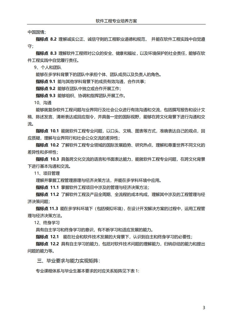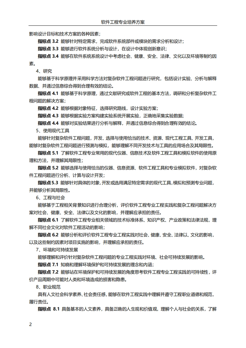 软件工程专业培养方案软件工程专业培养方案一、专业培养目标:培养具有高尚的职业道德和社会责任感,基础理论扎实,能系统地应用软件与计算机领域的基本理论、基本知识和基本技能与方法,工程实践能力强,分析和解决问题能力强,知识面宽广,德智体美劳全面发展的高级工程型专业技术人才,具备良好的团队沟通能力和一定的领导才能,具有终身学习意识和创新意识,具备国际化视野,熟悉软件生命周期的各个环节,能够解决软件工程领域实际复杂工程问题。毕业的学生可在科研机构、高等院校、政府机关、企事业单位等从事软件、计算机等相关领域的工程研究、技术开发、运行维护、项目管理以及信息服务等工作。经过五年左右的工作实践,本专业培养的学生应满足合格的软件系统工程师的基本要求,能独立承担复杂工程项目任务,成为项目团队的核心成员或团队负责人。二、毕业要求:根据软件工程专业特点及发展定位,基于本专业的培养目标,制定的毕业要求共有如下12条。对于每一项毕业要求,进行指标点的分解,得到37个指标点:1、工程知识能够将数学、自然科学、工程基础和软件工程专业知识应用于解决复杂软件工程问题。指标点1.1能将数学、自然科学、工程基础和软件工程科学的语言工具用于工程问题的表述;指标点1.2能针对具体的对象建立数学模型并求解;指标点1.3能够将相关知识和数学模型方法用于推演、分析软件工程专业工程问题;指标点1.4能够将相关知识和数学模型方法用于软件工程专业工程问题解决方案的比较与综合。2、问题分析能够应用数学、自然科学、软件工程、计算机的基本原理,识别、表达、并通过文献研究分析复杂软件工程问题,以获得有效结论。指标点2.1能运用数学、自然科学和工程科学的基本原理,识别和判断复杂工程问题的关键环节:指标点2.2能基于相关科学原理和数学模型方法正确表达复杂软件工程问题;指标点23能认识到解决问题有多种方案可选择,会通过文献研究寻求可替代的解决方案:指标点2.4能运用基本原理,借助文献研究等方法,分析复杂软件工程问题的影响因素,获得有效结论。3、设计/开发解决方案能够设计解决复杂软件工程问题的技术方案,能够设计并实现满足特定需求的软件系统或模块,并能够在设计环节中体现创新意识,考虑社会、健康、安全、法律、文化以及环境等因素指标点3.1掌握软件工程设计与产品开发的全周期、全流程的基本设计/开发技术和方法,了解1