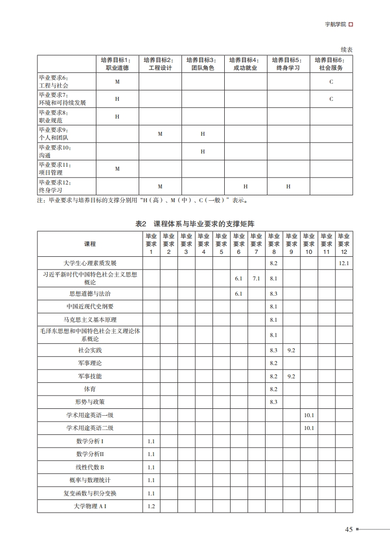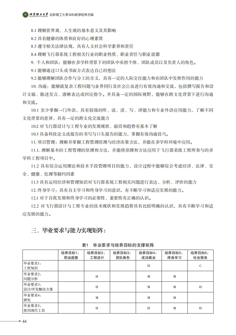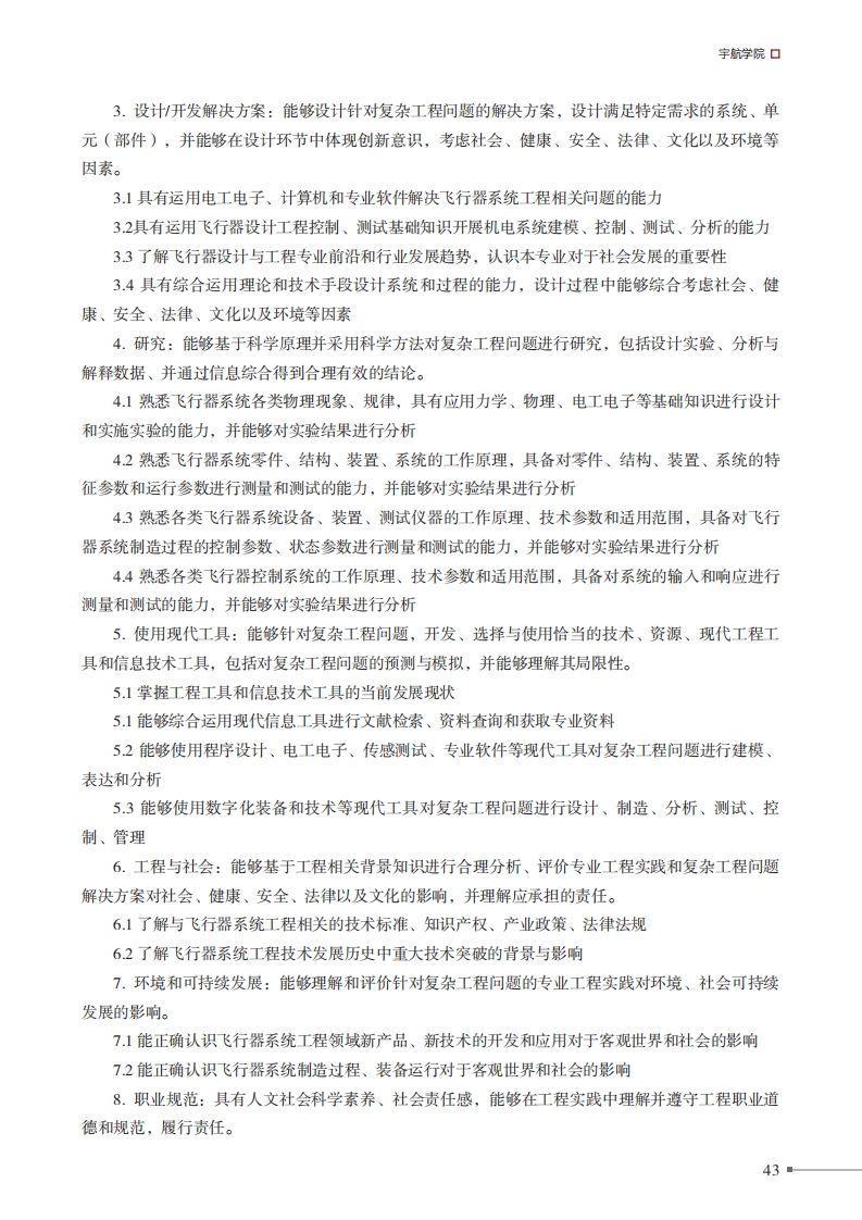 得北京理工大学北惊理工大学本科教学培养方案飞行器设计与工程专业培养方案一、专业培养日标:面向国家航空航天和国防重点技术领域,培养具备科学素养、工程素养和人文精神,适应社会主义现代化建设和新型工业发展需要,系统地掌握飞行器总体、结构、气动、控制等专业基础理论、方法和工具,具有科学的思维方法及综合处理科学技术问题的能力,能够在航空航天及兵器科学技术等相关领域从事飞行器系统的理论研究、设计与开发、实验研究以及技术管理等工作的理工结合、素质全面、工程实践能力和创造能力强的专门人才。本专业学生毕业后5年左右,预期达到以下目标:(1)具有高尚的道德和人文科学素养:(2)能够有效地运用工程技术规范设计飞行器系统技术解决方案:(3)具有良好的团队组织协调、沟通表达及竞争与合作能力:(4)在飞行器设计及其相关专业领域担任技术骨干或重要角色:(5)具有终身学习的意识,及自主学习和适应发展的能力;(6)具有国际交流、合作能力和为当地、本国、全球社会服务的能力。二、毕业要求:1.工程知识:能够将数学、自然科学、工程基础和专业知识用于解决复杂工程问题。1.1具有运用数学知识对飞行器设计工程相关问题进行建模、表达、分析、计算、求解的能力12具有运用自然科学知识对飞行器设计工程相关问题进行建模、表征、解释、分析的能力1.3具有运用工程基础知识对飞行器设计工程相关问题进行建模、表达、分析、计算、求解的能力1.4具有运用专业知识对飞行器设计工程相关问题进行建模、表征、解释、分析的能力2.问题分析:能够应用数学、自然科学和工程科学的基本原理,识别、表达、并通过文献研究分析复杂工程问题,以获得有效结论。21具有运用机械制图基础知识开展识图、绘图、表达的能力22具有运用力学基础知识对飞行器系统、过程进行建模、表达、分析、综合的能力23具有运用工程材料、机械原理、机械设计基础知识开展机械零件、结构、装置设计和分析的能力2.4具有综合运用机械、力学、控制等专业知识对飞行器等对象进行系统分析的能力■42
