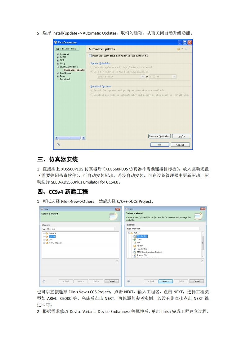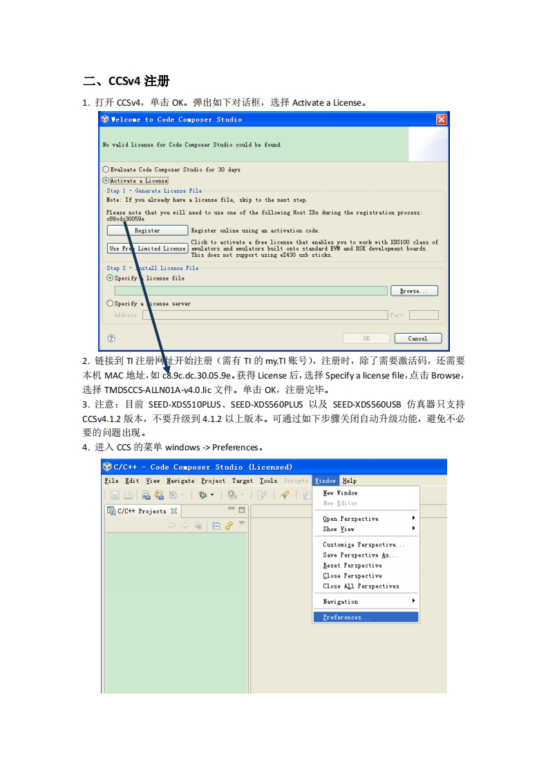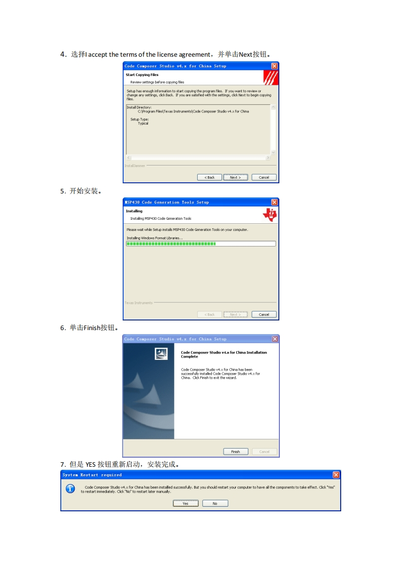 一、CCSv4安装1.放入光盘,若不自动弹出,点击autorun.exe,将弹出如下画面。然后,点击现在安装。腾Code Composer Studio4.x中国区☒Code ComposerTM Studio v4仅限中国区EmbeddedProcessor就在安使用指南Adobe Reade也5INSTRUMENTS风且金达思君2.点击yes确认安装。Install Code Composer Studio v4.x for China☒This will install Code Composer Studio v4.x for China on your computer.Continue?YesNo3.点击NEXT按钮.Code Composer Studio v4.x for China Setup☒Welcom to installCode Composer Studio v4.x forChinaWill install Code Composer Studio v4.x for China version4.1.2 on your computer.We recoment you to close allother program to install it.Click'Next"to start install,ClickNet之Cancel