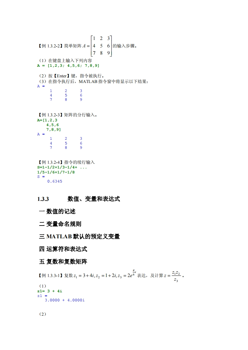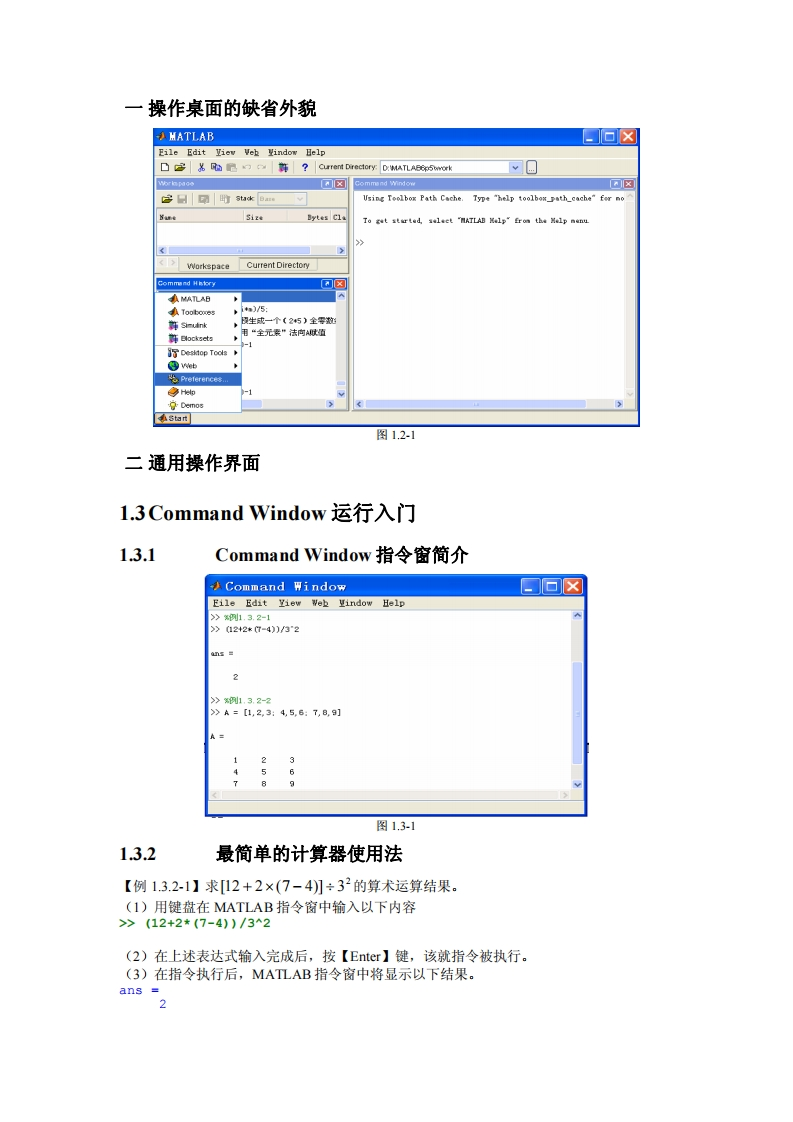 第一章基础准备及入门本章有两个目的:一是讲述MATLAB正常运行所必须具备的基础条件:二是简明系统地介绍高度集成的Desktop操作桌面的功能和使用方法。本章的前两节分别讲述:MATLAB的正确安装方法和MATLAB环境的启动。因为指令窗是MATLAB最重要的操作界面,所以本章用第1.3、1.4两节以最简单通俗的叙述、算例讲述指令窗的基本操作方法和规则。这部分内容几乎对MATLAB各种版本都适用。MATLAB6.x不同于其前版本的最突出之处是:向用户提供前所未有的、成系列的交互式工作界面。了解、熟悉和掌握这些交互界面的基本功能和操作方法,将使新老用户能事半功倍地利用MATLAB去完成各种学习和研究。为此,本章特设几节用于专门介绍最常用的交互界面:历史指令窗、当前目录浏览器、工作空间浏览器、内存数组编辑器、交互界面分类目录窗、M文件编辑/调试器、及帮助导航/浏览器。本章是根据MATLAB6.5版编写的,但大部分内容也适用于其他6.x版。1.1 MATLAB的安装和内容选择Prodnet List1.Selett directary hre prolcts vill he iastalledSpwce wailsble5...752312 Selact iastallatian options.Instull grodets ud drcmmentatien●1td1 grodets aly.●Instal1 decmmentation mlyWare Opticat11151Select lugunge of doementatioo.Inglish anlyCEnglish ud Jupinsse,if wuilalle:433■4.Selert predocts d/or docmentationSiaulinkAerospsce Blockset1.0.1CDMA Reference Blockset1.1「2Ccaxunicatices Blockset2.5Toolbox2.11548售p图1.1-11.2 Desktop操作桌面的启动1.2.1MATLAB的启动1.2.2Desktop操作桌面简介
