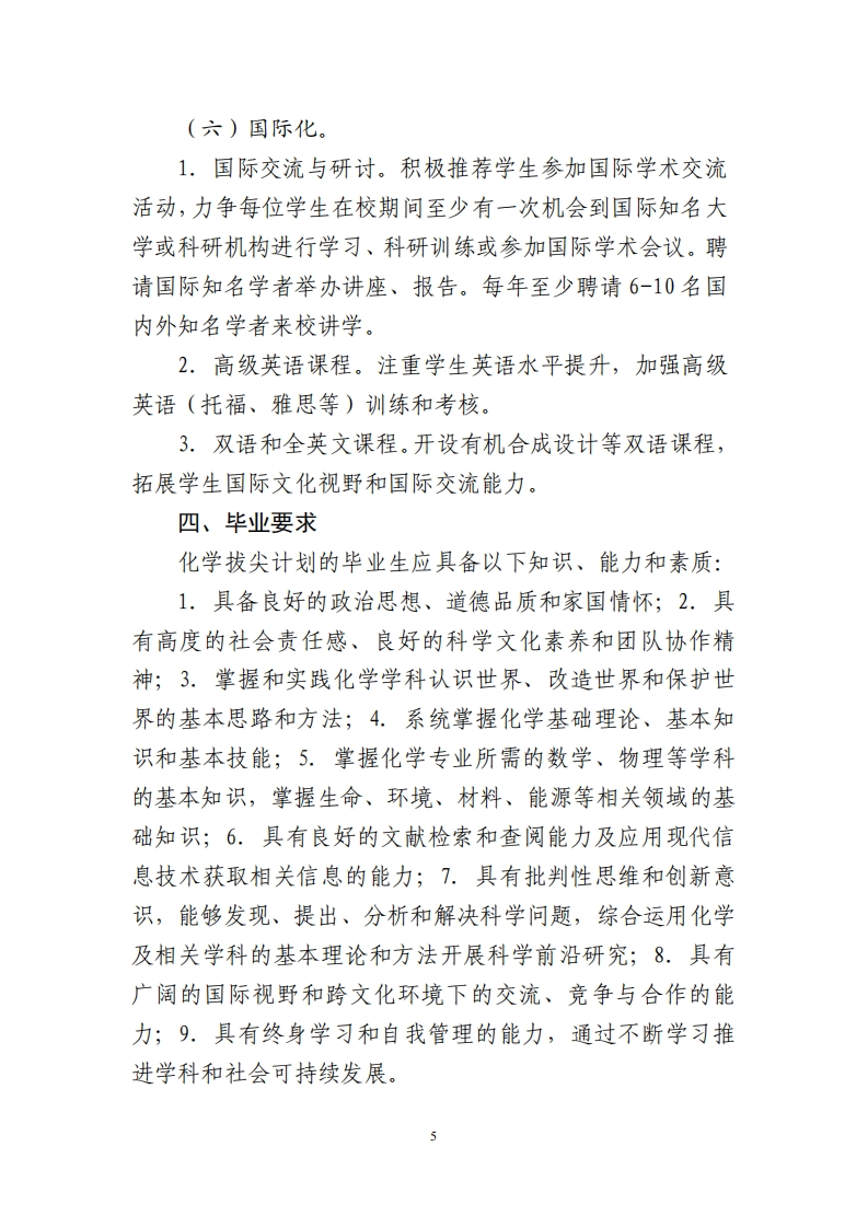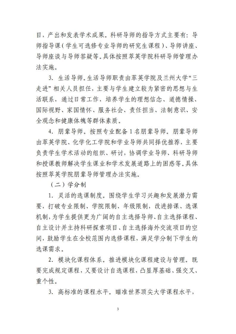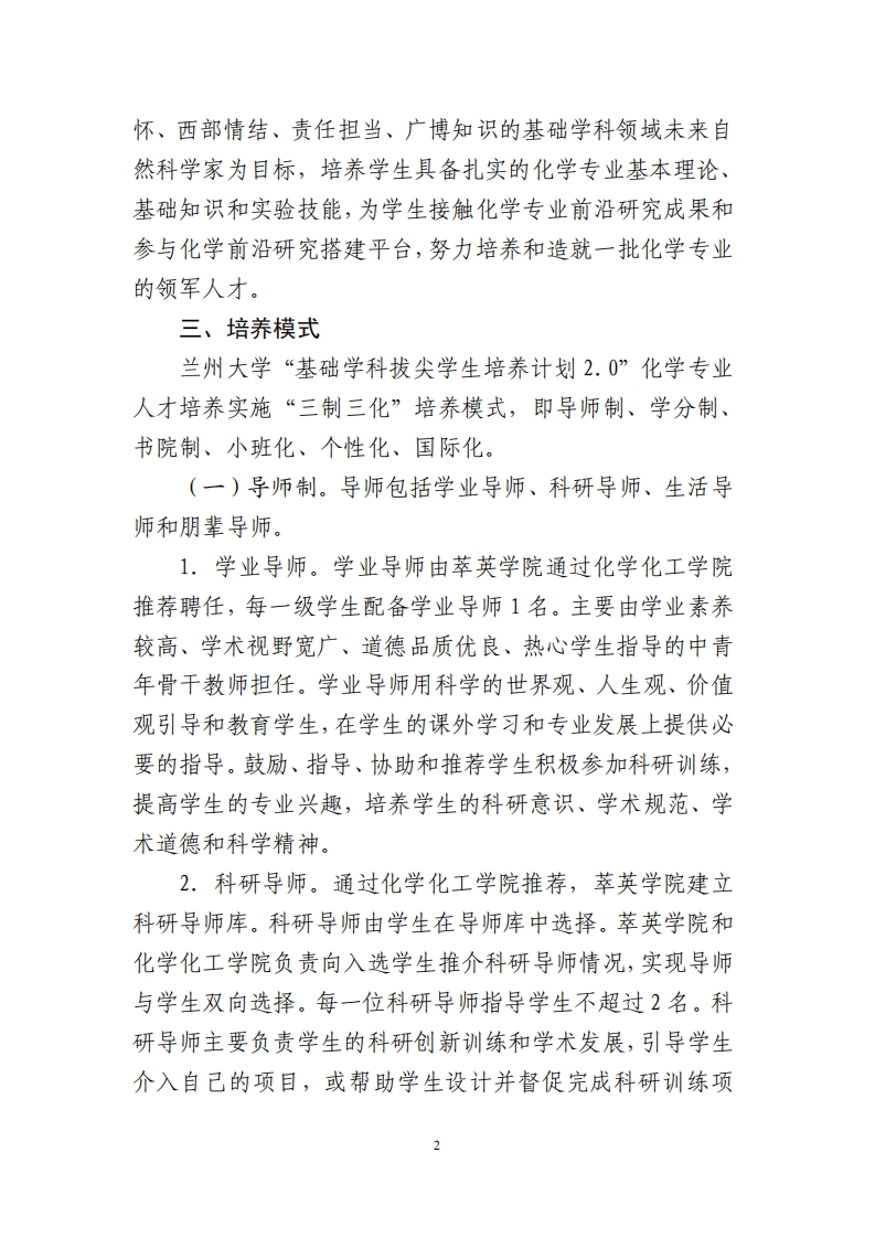 兰州大学“基础学科拔尖学生培养计划2.0”化学专业人才培养方案(2023版)一、专业简介兰州大学作为实施“基础学科拔尖学生培养试验计划”试点高校之一,于2010年设立化学萃英班。化学萃英班作为化学学科创新人才培养模式改革和试点平台,进行化学拔尖学生培养模式探索与实践。2019年首批入选“基础学科拔尖学生培养2.0基地”。化学是一门满足社会需要的中心科学,它在人类探索世界奥秘的过程中提供物质基础,并在改善人类生活、促进社会进步、保护环境、合理利用资源、开发新能源、新材料等社会可持续发展的各个方面起着其它学科不可替代的重要作用。化学专业主要学习化学基础理论、基本知识和基本技能,接受科学思维和科学实验的训练,培养具有良好科学素养,掌握化学基础理论、基本知识和基本技能,受到基础研究和应用研究的初步训练,能在化学及其相关领域从事科学研究、教学、应用开发和管理等工作的专门人才。兰州大学化学专业培养的毕业生以理论基础雄厚、实验动手能力强在国内外享有盛誉,萃英班毕业生绝大多数推荐免试研究生和出国继续深造。二、培养定位与目标坚持立德树人根本任务,以培养具有国际视野、家国情
