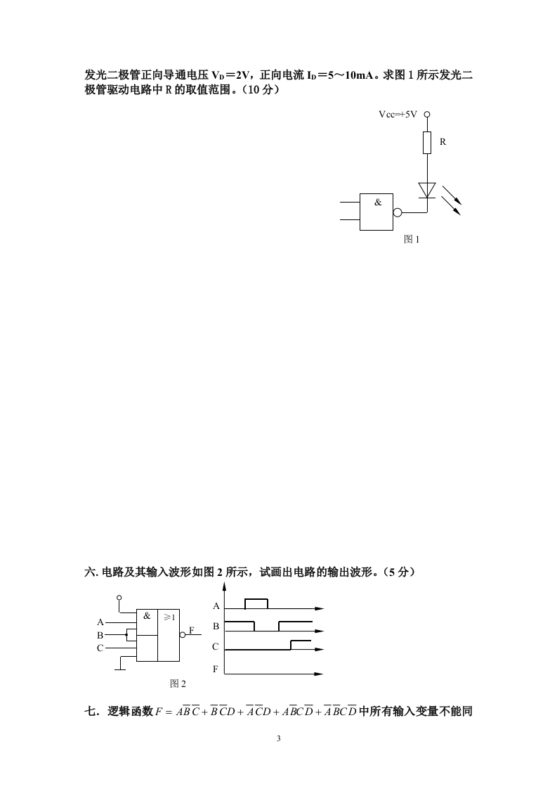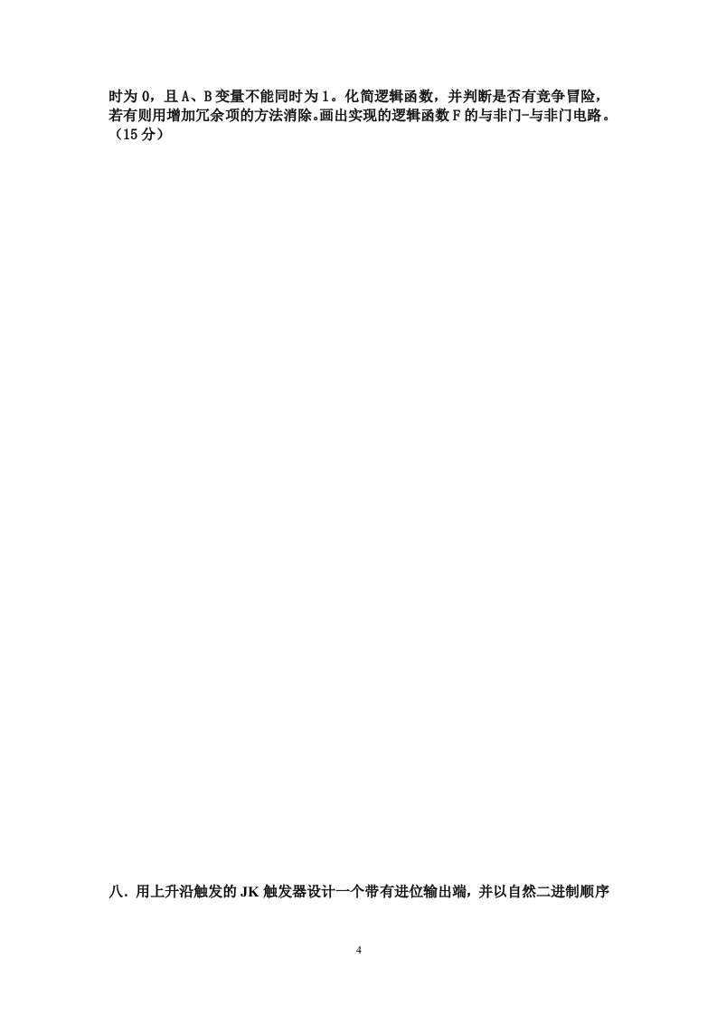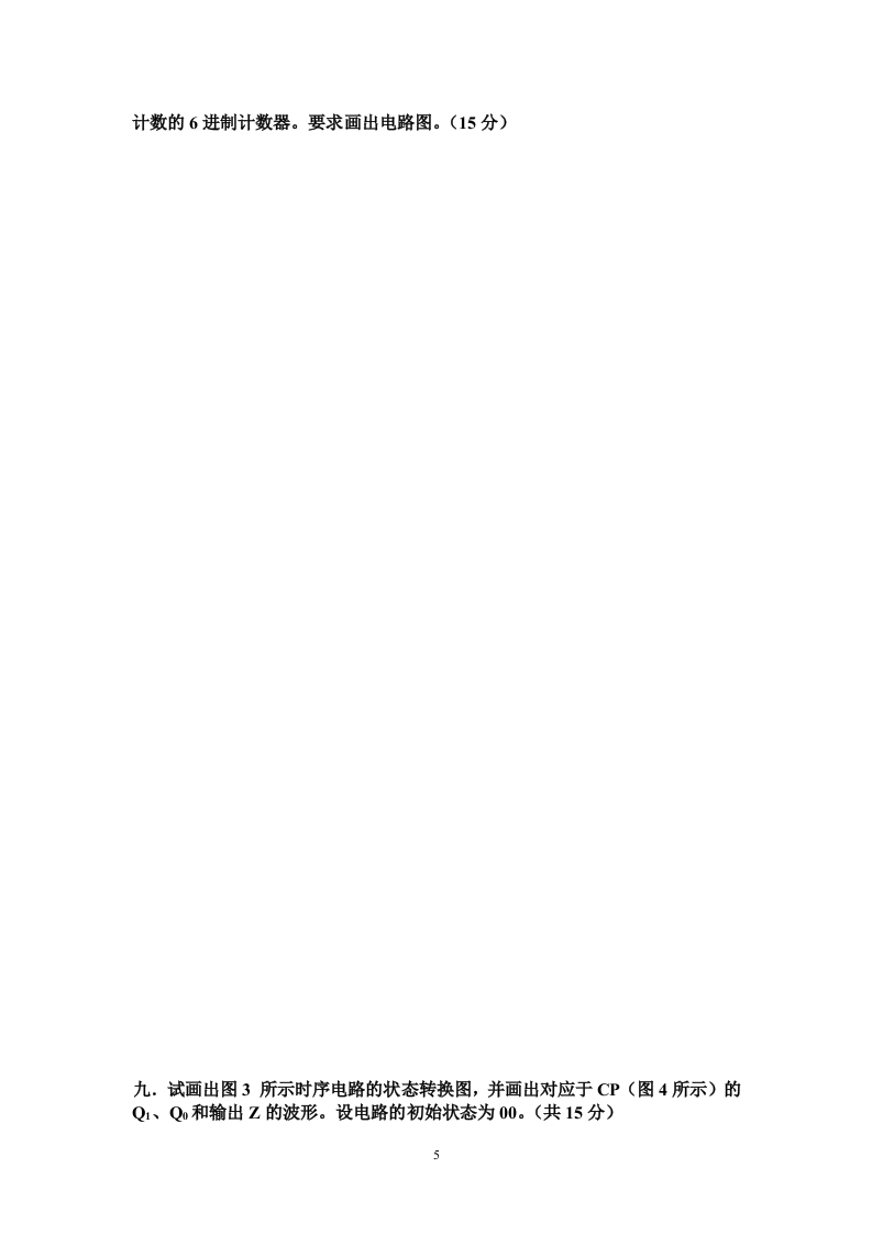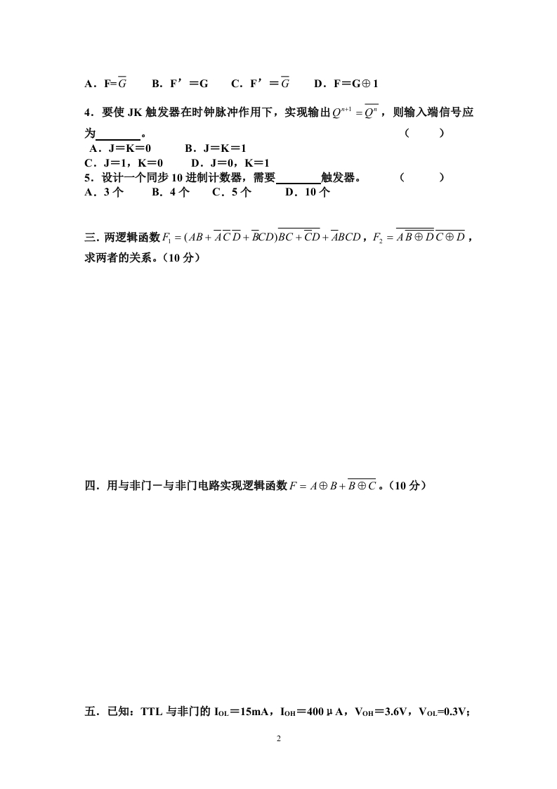 枣庄学院2011一2012学年度第一学期《数字电路》考试试卷(B卷)(考试时间:150分钟考试方式:开卷)班级:姓名:学号:题号二三四五六七八九总分分数考试内容1.判断题正确的在括号内记“√”,错误的记“X”(共10分,每题1分)1)“0”的补码只有一种形式。2)卡诺图中,两个相邻的最小项至少有一个变量互反。)3)用或非门可以实现3种基本的逻辑运算。()4)三极管饱和越深,关断时间越短。()5)在数字电路中,逻辑功能相同的TTL门和CMOS门芯片可以互相替代使用。6)多个三态门电路的输出可以直接并接,实现逻辑与。()7)时钟触发器仅当有时钟脉冲作用时,输入信号才能对触发器的状态产生影响。8)采用奇偶校验电路可以发现代码传送过程中的所有错误。()9)时序图、状态转换图和状态转换表都可以用来描述同一个时序逻辑电路的逻辑功能,它们之间可以相互转换。()10)一个存在无效状态的同步时序电路是否具有自启动功能,取决于确定激励函数时对无效状态的处理。)二.选择题(从下列各题的备选答案中选出1个或多个正确答案,将其填在括号中。共10分)1.不能将减法运算转换为加法运算。A.原码B.反码C.补码2.小数“0”的反码可以写为A.0.0*…0B.1.0…0C.0.1…1D.1.1…13.逻辑函数F-A⊕B和G=A⊙B满足关系