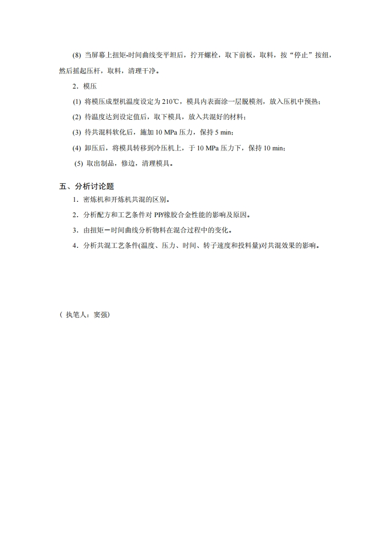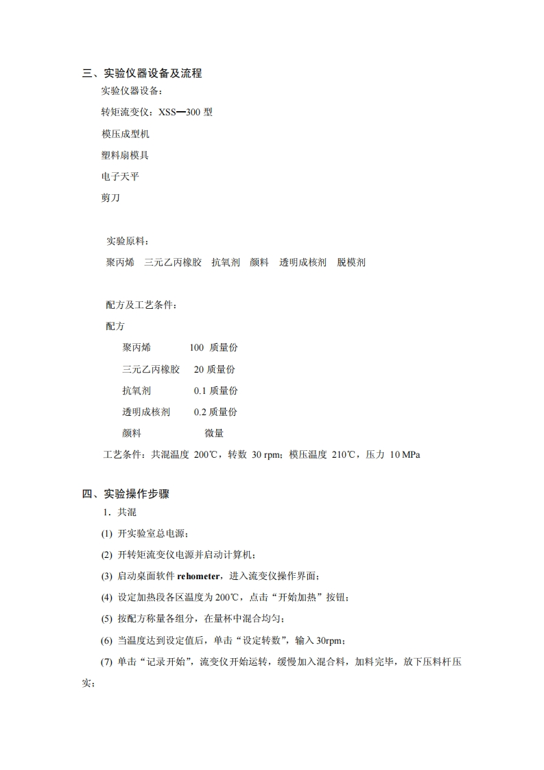 日用塑料制品的配方设计及塑料扇的成型加工方法一、实验目的1.学习并掌握日用塑料制品的组成与配方设计:2.了解日用塑料制品的成型加工方法:3.掌握压塑法制作塑料扇:4.学习转矩流变仪使用方法及在加工中的应用。二、实验原理为了使高分子材料具有更高、更多的综合性能、通过物理和化学方法将已有的两种和多种高分子材料进行共混复合,制得复合体系,人们形象地称之为“高分子合金”。聚丙烯(PP)作为五大通用塑料之一,具有比重轻,易加工,耐化学性,抗挠曲性和电绝缘性好等优异性能,但其冲击韧性特别是低温冲击韧性较差,影响了使用范围。为了改进PP的冲击韧性,人们往往在其中加入橡胶进行共混,制得增韧PP合金。影响增韧PP合金冲击韧性的因素有:(I)橡胶的种类。用于PP增韧的橡胶有EPDM、SBR、NR、BR、IR和IBR等。但由于各种橡胶和PP的相容性不同,改性的效果也不同。(2)橡胶粒子的大小。在增韧PP合金中,橡胶往往以粒子状存在于PP基质中。吸收冲击能,使抗冲性能提高,同时保持基质的优良性能。粒子大小是影响冲击韧性的重要因素之一。(3)其它如橡胶的含量,PP基质的结晶度,橡胶是否交联,是否加有其它增容剂等因素也对增韧PP合金的性能有很大的影响。高分子合金的制备方法可分为:开放式炼塑机开放共混法,密炼机密闭塑炼法以及双螺杆挤出机挤出共混法三种。其中密炼机密闭塑炼法是较重要的方法之一。在密炼机的混炼室内,物料的混炼过程比开炼机复杂得多。密炼机和开炼机的区别在于:被加工的物料在混炼室内完成,物料不仅在两个相对回转的转子间隙中,而且在转子与混炼室壁的间隙中,以及转子与上、下顶栓的间隙中受到了强烈而恒定的剪切作用,促使物料产生剪切变化而进行混炼。椭圆形转子密炼机的混炼塑化过程是通过以下几种作用来达到的:(1)转子与混炼室壁间的混炼作用:(2)两个转子的折卷与往返切割作用:(3)转子与卸料门间的搅拌作用。因此密炼机比开炼机有较高的生产效率和良好的工作环境。本实验采用乙丙橡胶等弹性体增韧改性聚丙烯来制备塑料扇,涉及高分子材料配方设计和成型加工两部分内容。