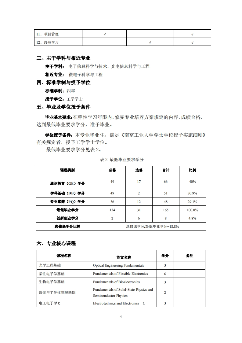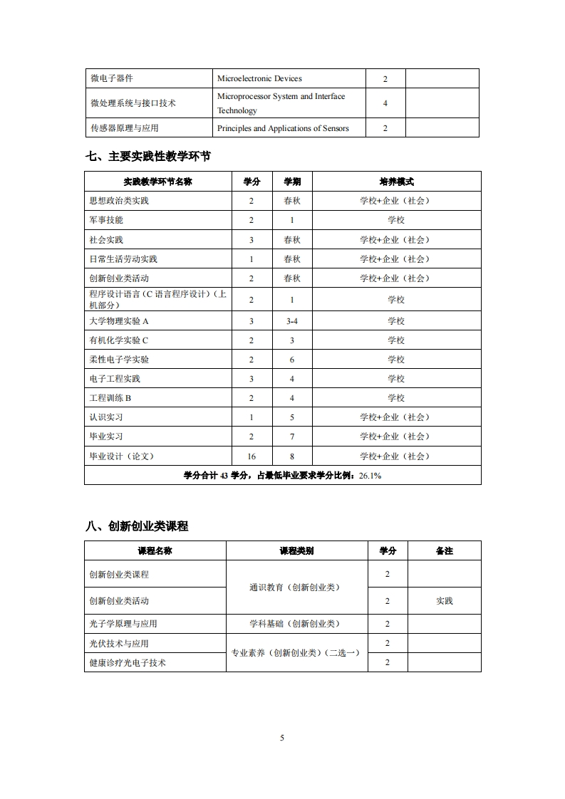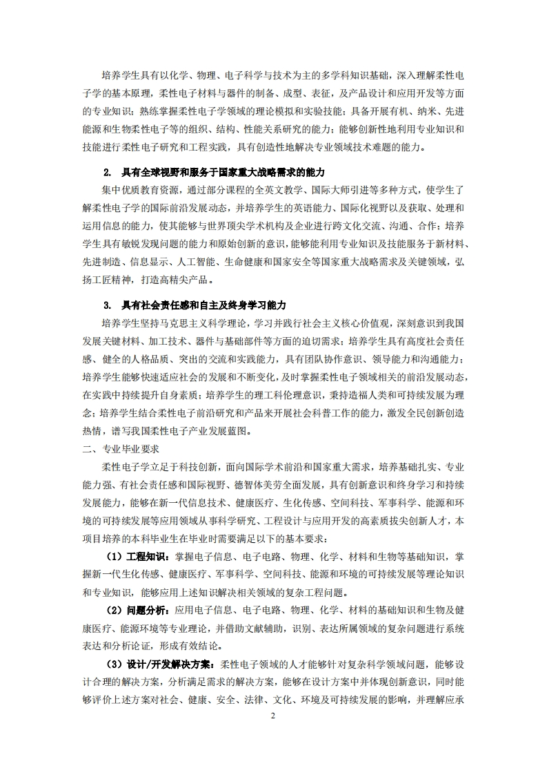 柔性电子学专业2023级培养方案学科门类工学专业类电子信息类制订人王娜娜审核人黄晓O、专业类及专业简介电子信息专业类是伴随着电子、通信、信息和光电子技术的发展而建立的,以数学、物理和信息论为基础,以电子、光子、信息及与之相关的元器件、电子系统、信息网络为研究对象,基础理论完备,专业内涵丰富,应用领域广泛,发展极为迅速,是推动信息产业发展和提升传统产业的主干专业。电子信息类专业具有理工融合特点的专业,主要涉及电子科学与技术、信总与通信工程、光学工程学科领域的基础理论、工程设计及系统实现技术。我校电子信总类下设电子信息工程、通信工程、光电信息科学与工程、人工智能、柔性电子学五个专业。柔性电子是将电子材料与柔性基底相结合,构建电子器件及其集成系统的一门新兴科学技术,面向信息显示、人工智能、先进材料、医疗健康、低碳能源、泛物联网和国防军工等应用领域。柔性电子学以电子科学与技术为核心学科,综合了以物理学为代表的基础学科,以电子信息为代表的前沿学科,从电子材料和器件的动态柔性行为出发,以光电材料、器件物理、柔性工艺和系统集成为研究对象,促进基础学科与应用学科的深度交叉融合。本专业拥有国家级协同创新中心、柔性电子材料与器件国际联合研究中心、柔性电子创新引智基地、柔性电子国家重点实验室培育建设点、教育部柔性电子国际合作联合实验室等多个重量级科研平台。一、专业培养目标本培养方案以习近平新时代中国特色社会主义高等教育思想为指导,以培养德智体美劳全面发展的一流人才为目标,依据《普通高等学校本科专业类教学质量国家标准》,参照“工程教育认证标准及专业补充标准”,符合学校定位和人才培养目标。本专业以立德树人的培养思路为核心,构建具有高水平和影响力的人才培养体系。坚持以具有家国情怀、责任担当、追求卓越的科学与工程技术人才培养模式为重点,学生不仅具有健康体魄、高尚品德和广博学识,而且具备国际化视野、原始创新能力和持久竞争力。所培养的学生能够充分服务于以柔性电子学为核心的新兴产业,成为新材料、先进制造、人工智能、生命健康和国家安全等关键领域的核心人才。本专业培养的学生在毕业后5年左右,经过自身学习和工作锻炼,预期达到以下目标:1.拥有丰富的知识储备和扎实的柔性电子专业技能