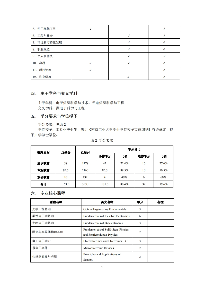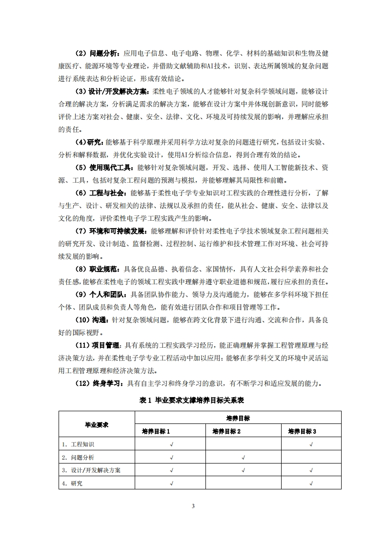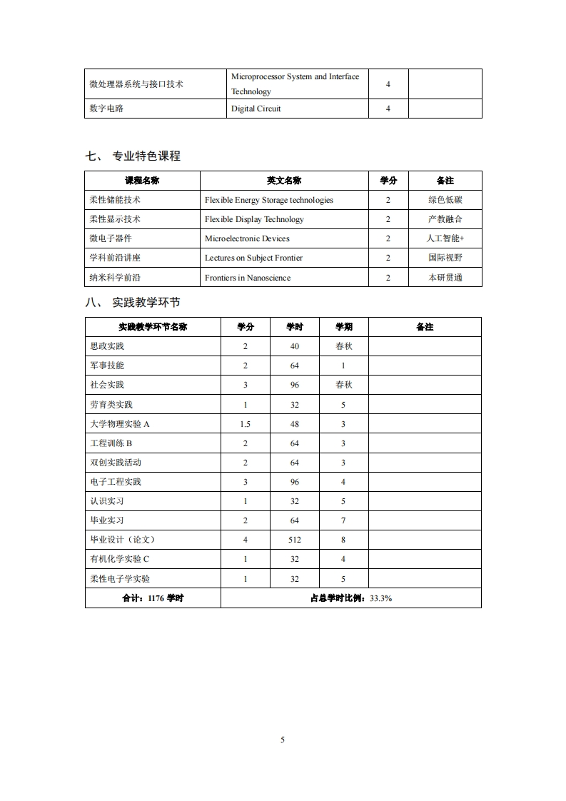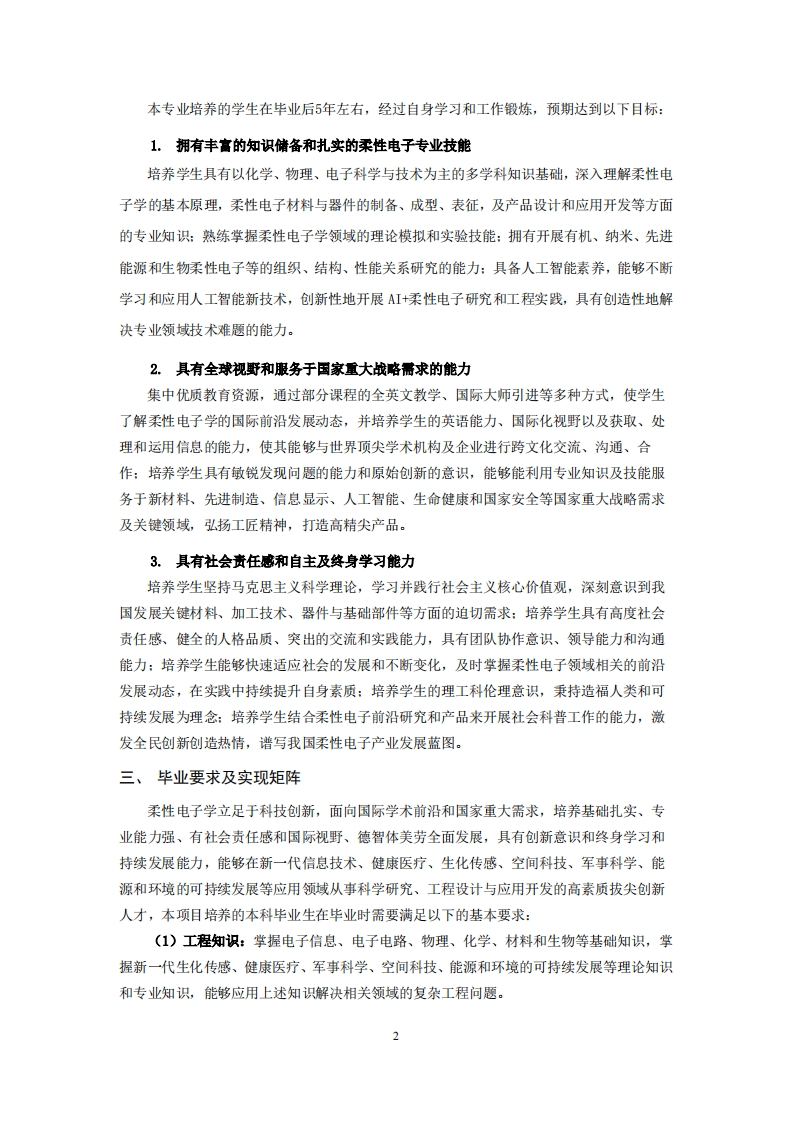 柔性电子学专业2024级培养方案专业负责人王娜娜制订人王娜娜审核人黄晓专业介绍电子信息专业类是伴随着电子、通信、信息和光电子技术的发展而建立的,以数学、物理和信总论为基础,以电子、光子、信息及与之相关的元器件、电子系统、信息网络为研究对象,基础理论完备,专业内涵丰富,应用领域广泛,发展极为迅速,是推动信息产业发展和提升传统产业的主干专业。电子信息类专业具有理工融合特点的专业,主要涉及电子科学与技术、信息与通信工程、光学工程学科领域的基础理论、工程设计及系统实现技术。我校电子信息类下设电子信息工程、通信工程、光电信息科学与工程、人工智能、柔性电子学五个专业柔性电子是将有机、无机或有机无机复合(杂化)材料沉积于柔性基底上形成以电路为代表的电子(光电子、光子学)器件及其集成系统的一门新兴、交叉科学技术。,面向信息显示、人工智能、先进材料、医疗健康、低碳能源、泛物联网和国防军工等应用领域。柔性电子学以电子科学与技术为核心学科,综合了以物理学为代表的基础学科,以电子信息为代表的前沿学科,从电子材料和器件的动态柔性行为出发,以光电材料、器件物理、柔性工艺和系统集成为研究对象,促进基础学科与应用学科的深度交叉融合。本专业拥有国家级协同创新中心、柔性电子材料与器件国际联合研究中心、柔性电子创新引智基地、柔性电子国家重点实验室培育建设点、教育部柔性电子国际合作联合实验室等多个重量级科研平台。二、培养目标本培养方案以习近平新时代中国特色社会主义高等教育思想为指导,以培养德智体美劳全面发展的一流人才为目标,依据《普通高等学校本科专业类教学质量国家标准》,参照“工程教育认证标准及专业补充标准”,符合学校定位和人才培养目标。本专业以立德树人的培养思路为核心,构建具有高水平和影响力的人才培养体系。坚持以具有家国情怀、责任担当、追求卓越的科学与工程技术人才培养模式为重点,学生不仅具有健康体魄、高尚品德和广博学识,而且具备国际化视野、创新能力、创业精神和持久竞争力。所培养的学生能够充分服务于以柔性电子学为核心的新兴产业,成为新材料、先进制造、人工智能、生命健康和国家安全等关键领域的核心人才。
