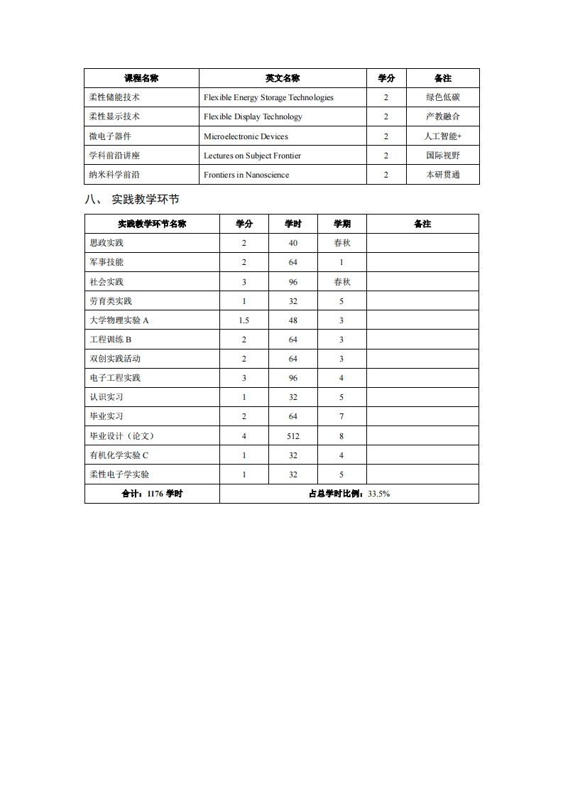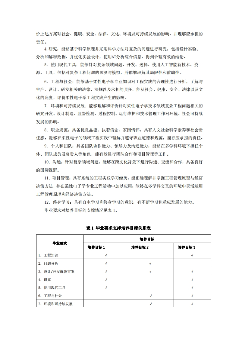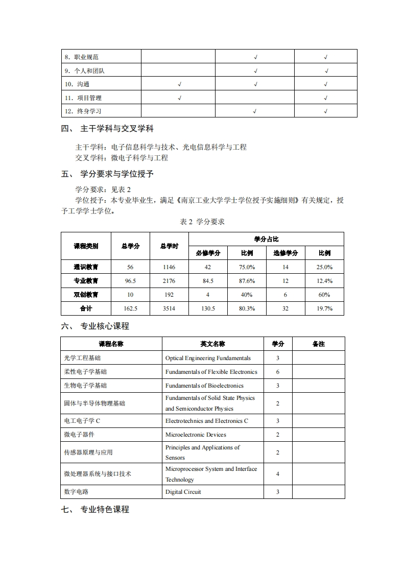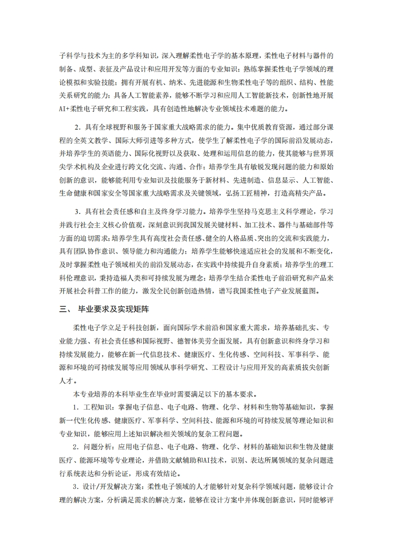 柔性电子学专业2025级培养方案专业负责人王娜娜制订人王娜娜审核人黄晓专业介绍电子信息专业类是伴随着电子、通信、信总和光电子技术的发展而建立的,以数学、物理和信息论为基础,以电子、光子、信息及与之相关的元器件、电子系统、信息网络为研究对象,基础理论完备、专业内涵丰富、应用领域广泛,发展极为迅速,推动信息产业发展和提升传统产业的主干专业。电子信息类专业是具有理工融合特点的专业,主要涉及电子科学与技术、信息与通信工程、光学工程学科领域的基础理论、工程设计及系统实现技术。南京工业大学电子信息类专业下设电子信息工程、通信工程、光电信息科学与工程、人工智能、柔性电子学五个专业。柔性电子是将有机、无机或有机无机复合(杂化)材料沉积于柔性基底上形成的以电路为代表的电子(光电子、光子学)器件及其集成系统的一门新兴、交叉科学技术。面向信息显示、人工智能、先进材料、医疗健康、低碳能源、泛物联网和国防军工等应用领域。柔性电子学以电子科学与技术为核心学科,综合了以物理学为代表的基础学科,以电子信息为代表的前沿学科,从电子材料和器件的动态柔性行为出发,以光电材料、器件物理、柔性工艺和系统集成为研究对象,促进基础学科与应用学科的深度交叉融合。柔性电子学专业拥有国家级协同创新中心、柔性电子材料与器件国际联合研究中心、柔性电子创新引智基地、柔性电子国家重点实验室培育建设点、教育部柔性电子国际合作联合实验室等多个重量级科研平台。二、培养目标本培养方案以习近平新时代中国特色社会主义思想为指导,以培养德、智、体、美、劳全面发展的一流人才为目标,依据《普通高等学校本科专业类教学质量国家标准》,参照“工程教育认证标准及专业补充标准”,符合学校定位和人才培养目标。本专业以立德树人的培养思路为核心,构建具有高水平和影响力的人才培养体系。坚持以具有家国情怀、责任担当、追求卓越的科学与工程技术人才培养模式为重点,学生不仅具有健康体魄、高尚品德和广博学识,而且具备国际化视野、创新能力、创业精神和持久竞争力。本专业所培养的学生能够充分服务于以柔性电子学为核心的新兴产业,成为新材料、先进制造、人工智能、生命健康和国家安全等关键领域的核心人才。本专业培养的学生在毕业后5年左右,经过自身学习和工作锻炼,预期达到以下目标:1.拥有丰富的知识储备和扎实的柔性电子专业技能。培养学生掌握以化学、物理、电