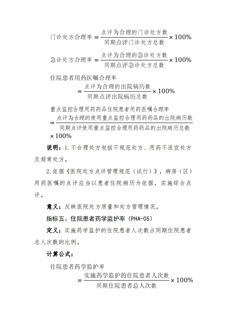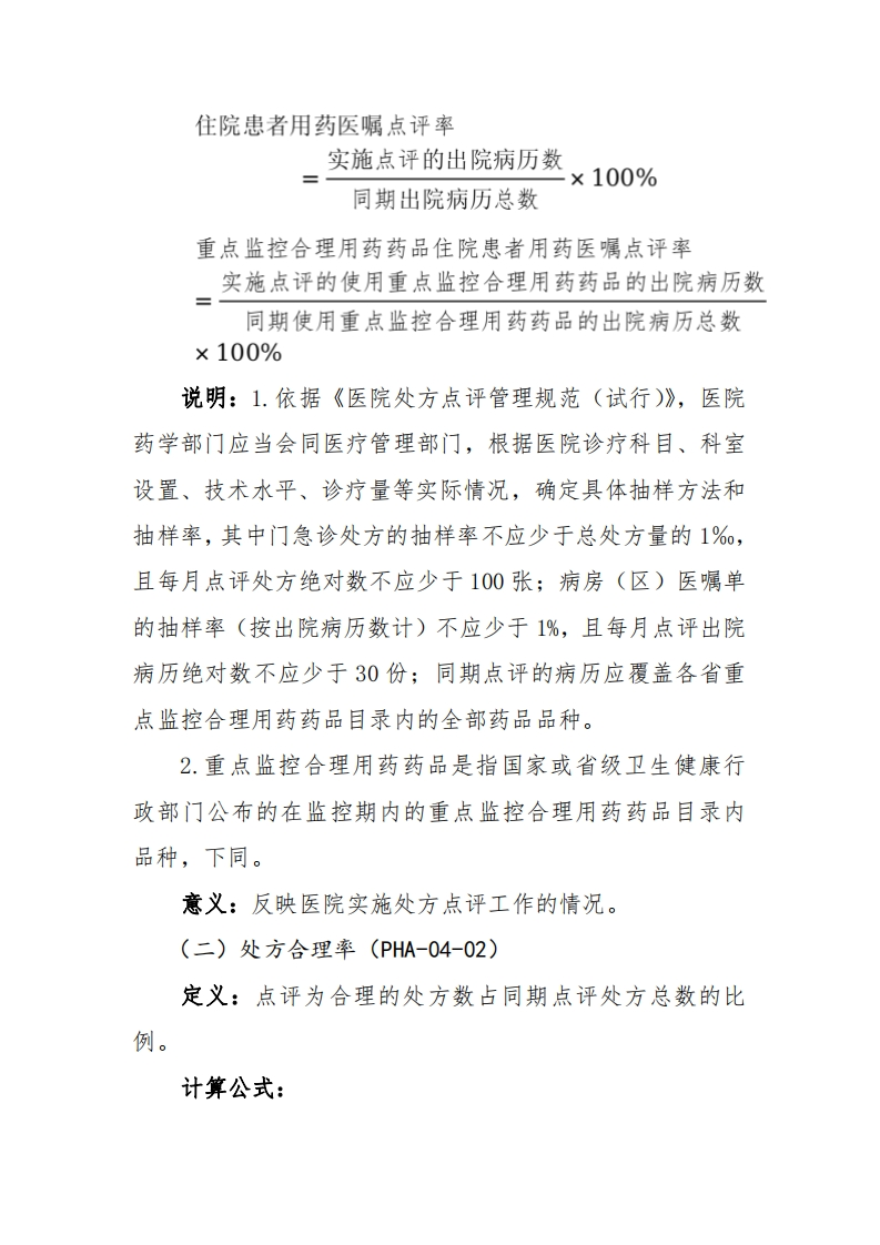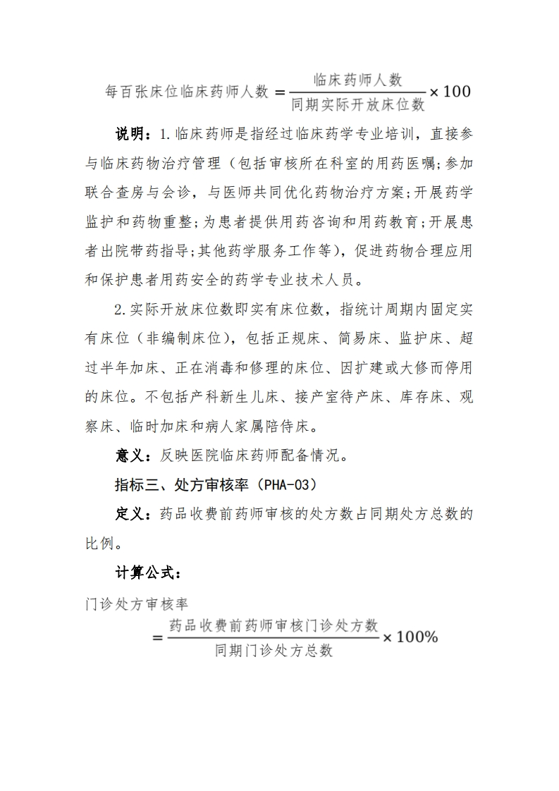 附件1药事管理专业医疗质量控制指标(2025年版)指标一、医师人数与药师人数之比(PHA-O1)定义:医院注册医师总人数与医院药师总人数之比。计算公式:医院注册医师总人数医师人数与药师人数之比=医院药师总人数说明:1.医院注册医师总人数是指国家医师电子化注册系统显示已激活状态并承担相关岗位任务的在岗(助理)医师总人数,以主要执业机构进行统计。2.医院药师总人数是指按照有关规定取得药学专业任职资格(主任药师、副主任药师、主管药师、药师、药士),并承担药学相关岗位任务的在岗人员。在岗人员包括在编及合同制人员、派遣人员、返聘和临聘本单位半年以上人员,不包括离退休人员、退职人员、离开本单位仍保留劳动关系人员、返聘和临聘不足半年人员。意义:反映医院药学专业人力资源配置情况。指标二、每百张床位临床药师人数(PHA-O2)定义:每100张实际开放床位配备的临床药师人数。计算公式: