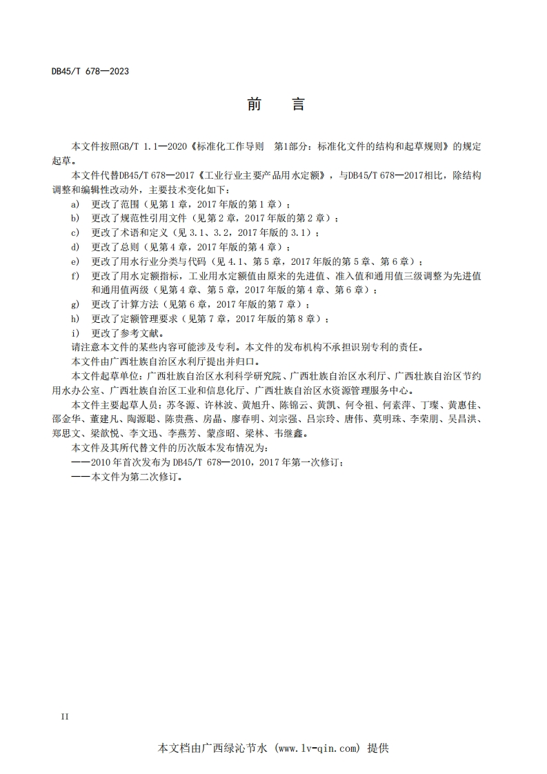 BD45T678-2023348072@abc3天前发布关注私信1.53MB28页043BD45T678-2023此内容为付费资源,请付费后查看¥19¥23黄金会员免费钻石会员免费立即购买您当前未登录!建议登陆后购买,可保存购买订单付费资源 第1页 / 共28页 第2页 / 共28页 第3页 / 共28页 第4页 / 共28页 第5页 / 共28页 试读已结束,还剩23页,您可下载完整版后进行离线阅读 THE END标准规范 文本预览 ICS13.060.25CCS P 400B45广西壮族自治区地方标准DB45/T678-2023代替DB45/T678-2017工业行业主要产品用水定额Norm of water intake for major industrial products2023-08-10发布2023-09-30实施广西壮族自治区市场监督管理局发布本文档由广西绿沁节水(www.lv-qin.com)提供 查看更多 收起部分 喜欢就支持一下吧收藏