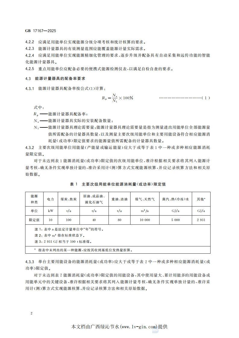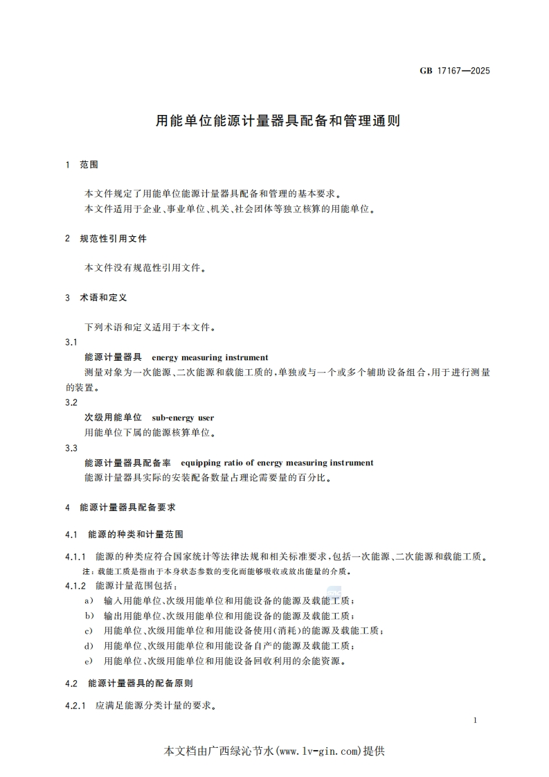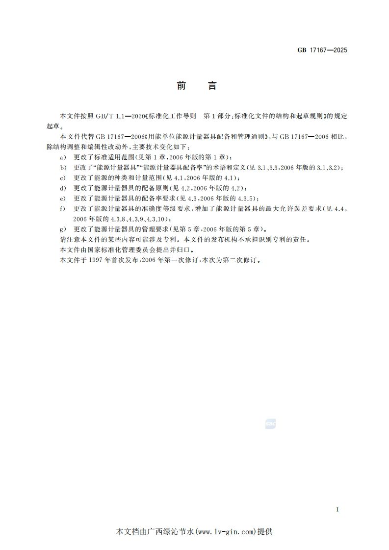 ICS27.010CCS F 01GB中华人民共和国国家标准GB17167-2025代替GB17167一2006用能单位能源计量器具配备和管理通则General rules for energy measuring instrument equipping and managing ofenergy user2025-01-24发布2026-02-01实施国家市场监督管理总局发布国家标准化管理委员会本文档由广西绿沁节水(www.1v-gin.com)提供