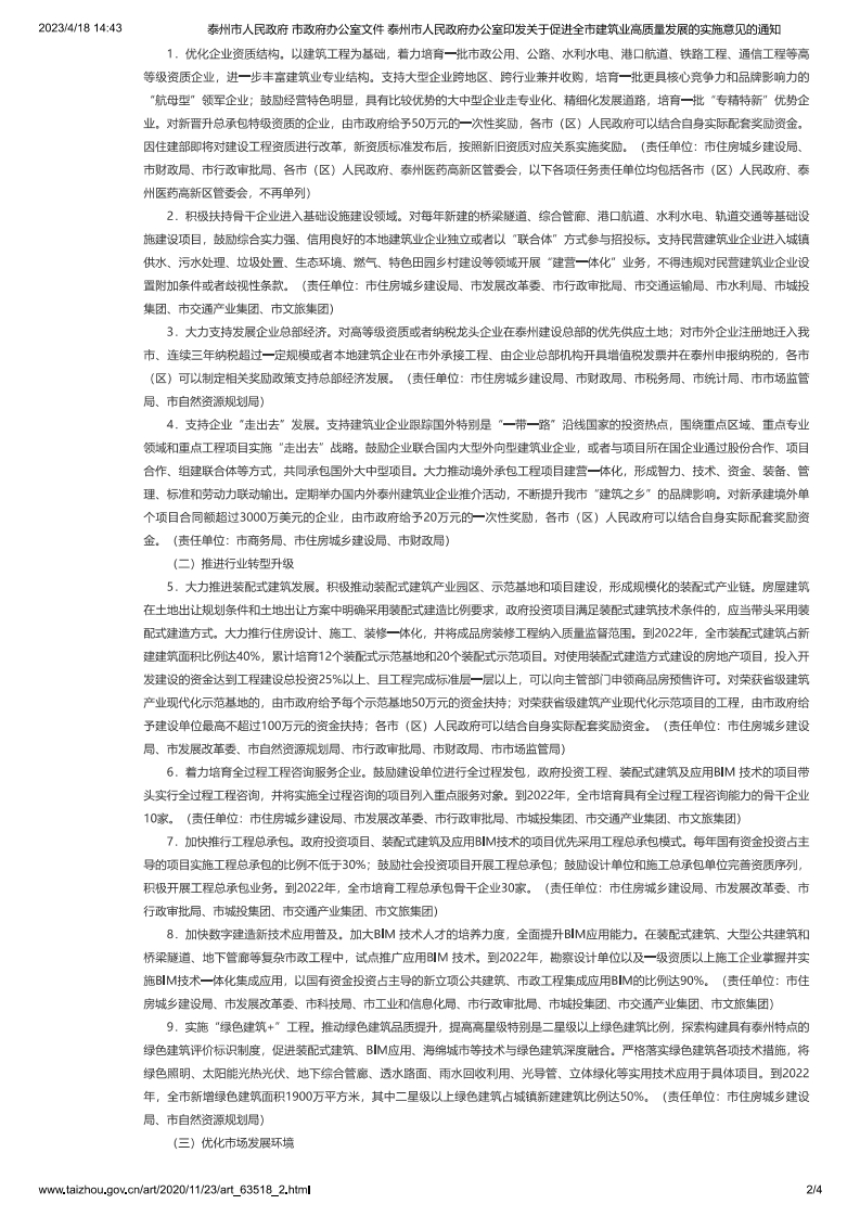2023/4/1814:43泰州市人民政府市政府办公室文件泰州市人民政府办公室印发关于促进全市建筑业高质量发展的实施意见的通知泰州市人民政府www.taizhou.gov.cn首页党务政务新闻中心全景泰州政府信息公开办事服务政民互动数据开放合首页>党务政务>党政期刊>攻府公报>2020年第11期>市政府办公室文件泰州市人民政府办公室印发关于促进全市建筑业高质量发展的实施意见的通知发布日期:2020-11-231420浏览次数:1929文号:泰政办发〔2020)49号发文日期:2020-10-30各市(区)人民政府,泰州医药高新区管委会,市各委、办、局,市各直属单位:《关于促进全市建筑业高质量发展的实施意见》已经市政府第47次常务会议讨论通过,现印发给你们,请认真贯彻落实,素州市人民政府办公室2020年10月30日(此件公开发布)关于促进全市建筑业高质量发展的实施意见为促进我市建筑业产业结构调整和转型升级,提升“泰州建造”品牌含金量和影响力,为建设“强富美高”新泰州提供有力支撑,根据《国务院办公厅关于促进建筑业持续健康发展的意见》(国办发〔2017)19号)和《省政府关于促进建筑业改革发展的意见》(苏政发〔2017)151号)等规定,结合本市实际,制定本意见。一、指导思想以习近平新时代中国特色社会主义思想为指导,全面贯彻党的十九大和十九届二中、三中、四中全会精神,认真落实党中央,国务院和省委、省政府决策部署,牢固树立新发展理念,综合运用政策引导、项目带动、市场培育、资金激动等手段,持续优化营商环境,促进行业转型升级,增强企业核心竞争力和发展潜力,实现我市建筑业高质量发展。二、工作目标到2022年底,全市建筑业发展实现以下目标(一)产业支撑作用更加明显,全市建筑业总产值达到5000亿元以上,建筑业增加值占全市生产总值的比重保持在10%左右,建筑业入库税收达到60亿元以上。(二)企业综合实力更加强劲。全市施工总承包特级企业达到10家,总承包一级企业达到100家,其中,年产值超100亿元企业8家,超50亿元企业20家。(三)行业转型升级更加全面。全市城镇绿色建筑占新建建筑比例达到100%,装配式建筑面积占新建建筑面积比例达到40%,通过江苏省建筑产业化示范城市验收。工程总承包、全过程咨询、建筑信息模型(M)应用等加快推广,高星级绿色建筑、成品化住房比例稳步增长,建筑市场秩序不断规范,工程质量安全水平全面提高。三、重点任务(一)扶持企业做优做强www.taizhou.gov.cn/art/2020/11/23/art 63518 2.html1/4