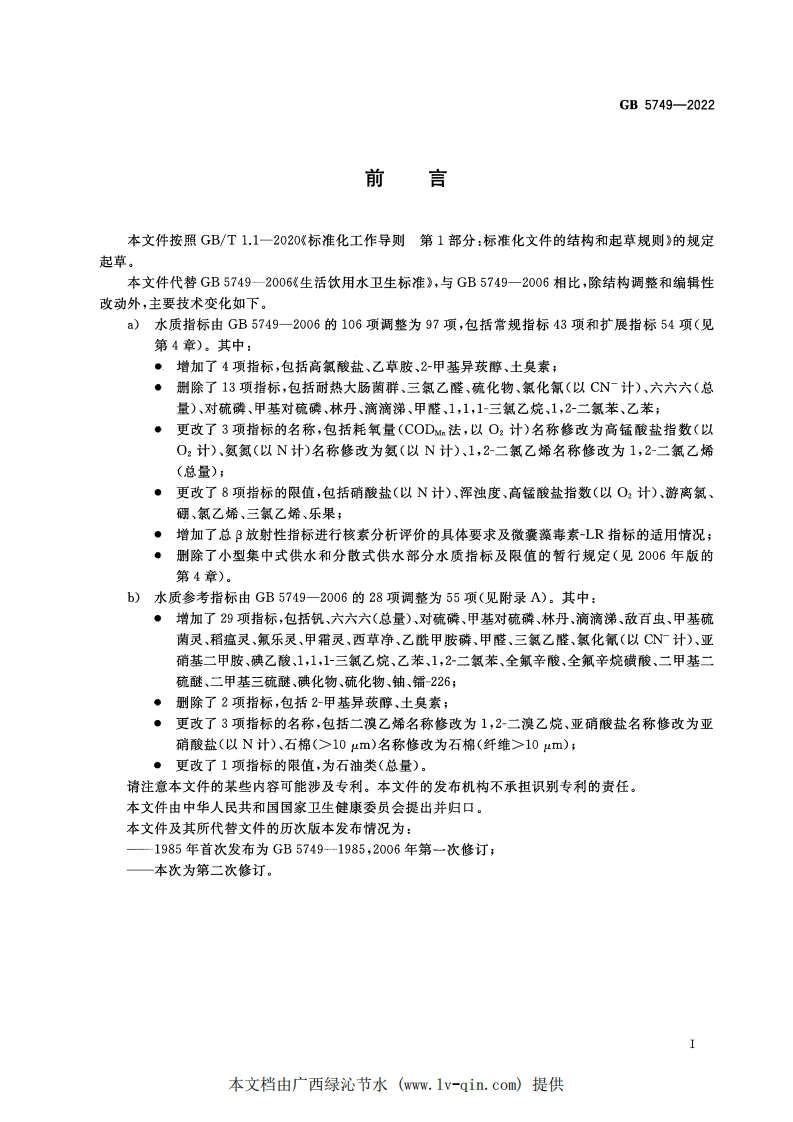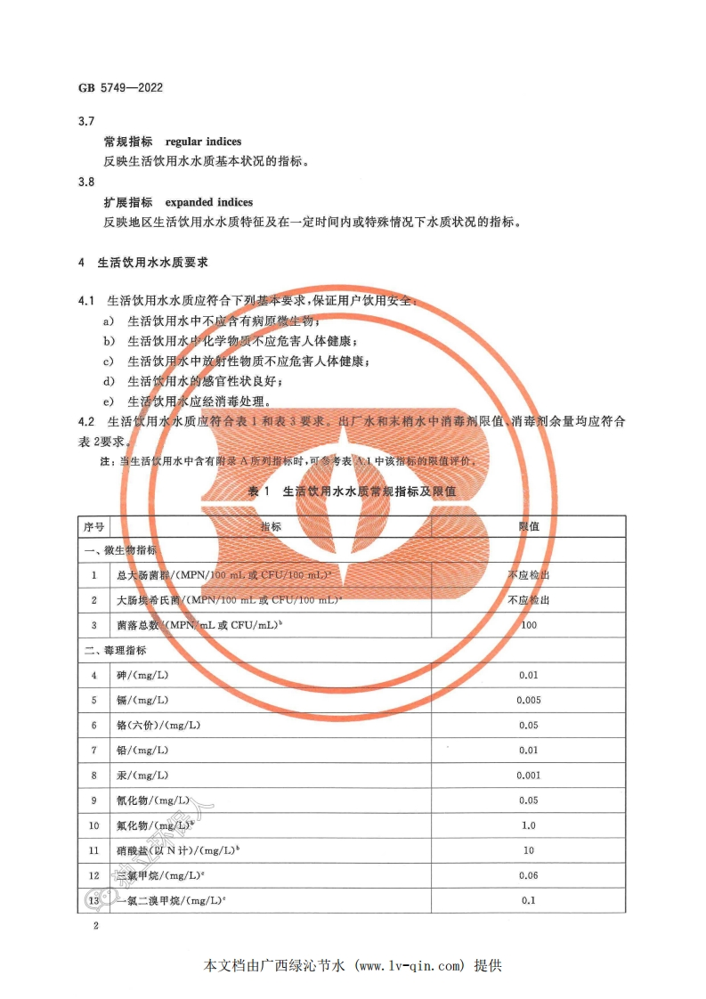 GB5749348072@abc前天发布关注私信1.98MB13页049GB5749此内容为付费资源,请付费后查看¥19¥23黄金会员免费钻石会员免费立即购买您当前未登录!建议登陆后购买,可保存购买订单付费资源 第1页 / 共13页 第2页 / 共13页 第3页 / 共13页 第4页 / 共13页 第5页 / 共13页 试读已结束,还剩8页,您可下载完整版后进行离线阅读 THE END标准规范 文本预览 ICS13.060CCS C 51中华人民共和国国家标准GB5749-2022代替GB5749一2006生活饮用水卫生标准Standards for drinking water quality2022-03-15发布2023-04-01实施国家市场监督管理总局国家标准化管理委员会发布本文档由广西绿沁节水(www.1v-qin.com)提供 查看更多 收起部分 喜欢就支持一下吧收藏