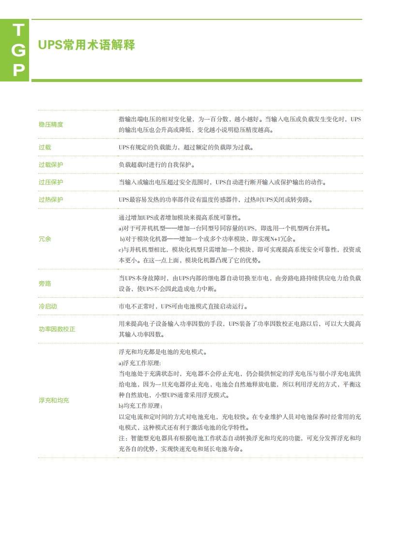 UPS常用术语解释号万电源产品高频机利用高频开关技术,通过IGBT高频整流斩波升压的UPS称为UPS高频机。工频机采用工频整流、逆变器输出变压器升压的UPS俗称工频机。电源效率即在负载大小满足额定输出功率、蓄电池满电荷的情况下,额定输出功率与输入功率之比。反映系统可靠性及冗余性的指标,用来描述设备平均能正常工作的时间长短的参数,MTBF可靠性(MTBF】越大表示该设备的寿命越长。平均维修时间(MTTR)】维修系统所花的时间。三遥遥信、遥测、遥控。指设备的远程监控。EPO(Emergency power off)又称为紧急电源关断开关,在紧急情况下,通过EPO可以断开UPS的输出。EPO为一个常开触点,无需外部电源,由UPS的一个12V/24V的电源驱动。EP0的主EPO要功能是通过一个远程的无源或有源开关电路,在紧急情况下,比如火灾发生时,将远程的UPS紧急关闭。经济运行模式,平时由市电供电,逆变器待机:市电故障时才由逆变器供电。EC0工作时,ECOUPS输出电源质量将得不到保障。电能利用效率。Power Usage Effectiveness的缩写,是评价数据中心能源效率的指标,是数据PUE中心消耗的所有能源与T负载使用的能源之比。TCO总体拥有成本。Total Cost of Ownership的缩写,是购买成本和运行成本的总和负载调整率负载发生变化时输出端的稳压精度所谓的CF是指周期波形的峰值与有效值之比。由于计算机性负载接受正弦波电压会产生C℉峰值因数(CF)(介于2.4-2.6倍的电流),因此,UPS设计时常需能提供C℉值3的规格,以满足电脑性负载的应用。通信协议互联设备间在进行数据交换时所共同遵守的规则。输入电流谐波当设备功率因数不为1时,输入电流波形就会发生畸变,产生谐波电流。输入电压范围UPS允许市电变化的范围,范围越大说明UPS适应性越好。我国电网标准频率是50Hz,UPS允许市电频率有一定的变化范围,在这个范围内,UPS同步输入频率范围跟踪市电频率,超出则以本机频率输出。