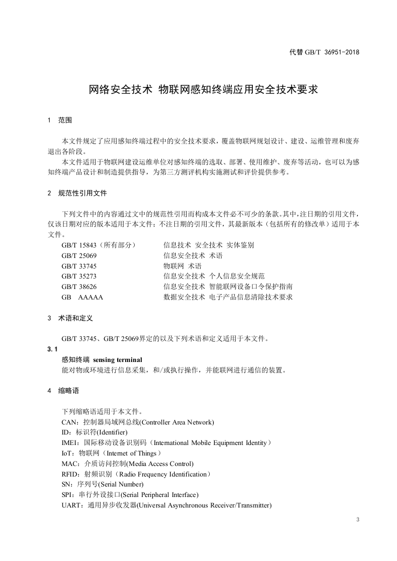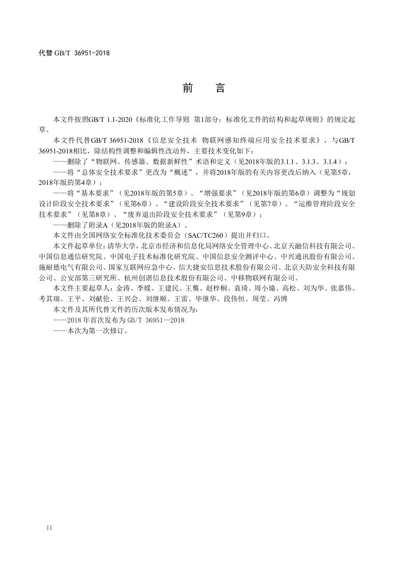 ICS35.030CCS L80中华人民共和国国家标准GB/T 36951-XXXX代替GB/T36951-2018网络安全技术物联网感知终端应用安全技术要求Cybersecurity technology-Security technical requirements for application ofsensing terminals in Internet of Things(征求意见稿)(本稿完成日期:2025-11-30)XXXX-Xx-X发布XXXX-XX-XX实施国家市场监督管理总局闲家标淮化管理委贞会发布